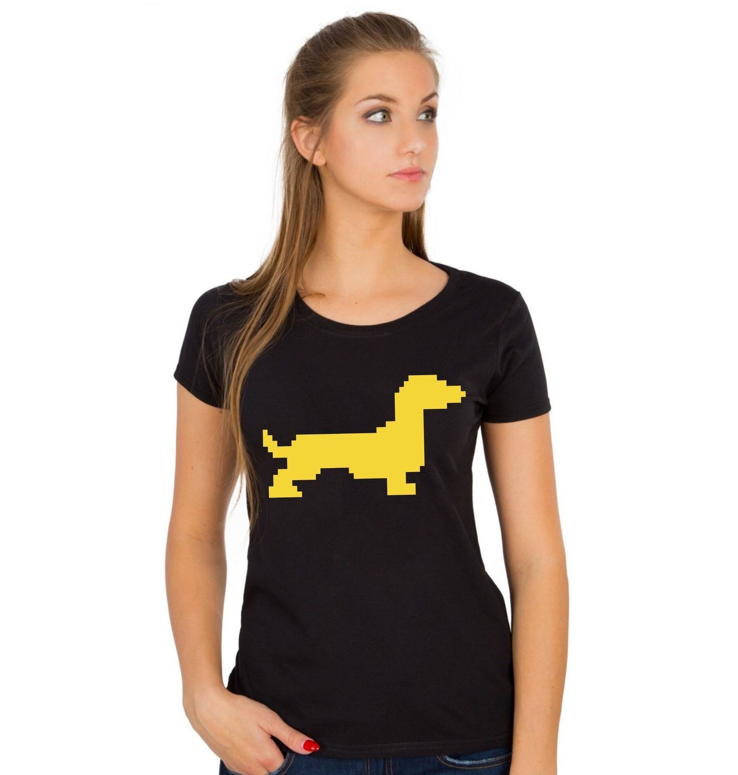Dámské tričko Pixelový Jezevčík 80s. Minimalistický motiv, který na první pohled jasně říká, o co jde. Stylizovaný pes v pixelovém provedení tvoří jednoduchou, ale výraznou siluetu jezevčíka na kontrastním pozadí. Ideální volba pro každého pejskaře, který má rád čistý design, hravost a trochu retro stylu.