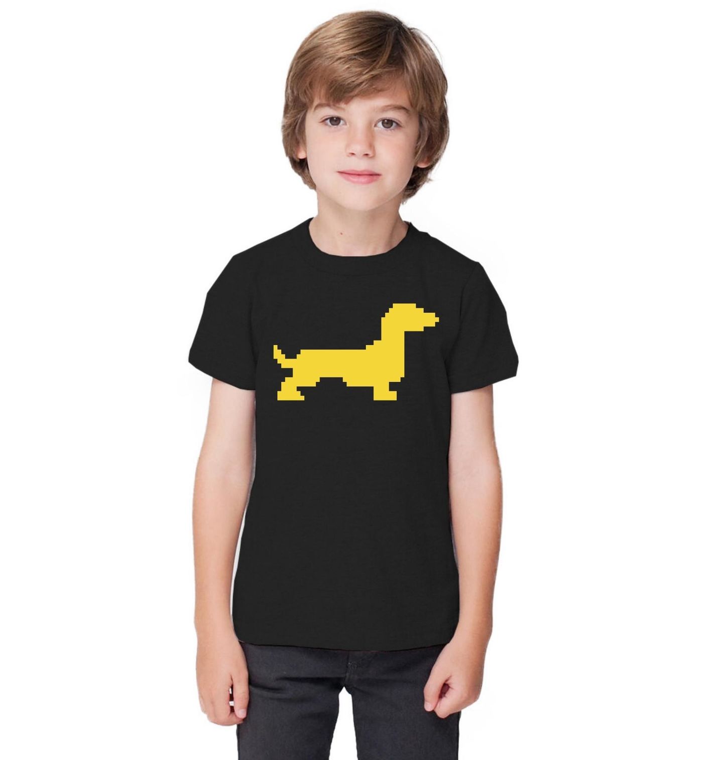 Dětské tričko Pixelový Jezevčík 80s. Minimalistický motiv, který na první pohled jasně říká, o co jde. Stylizovaný pes v pixelovém provedení tvoří jednoduchou, ale výraznou siluetu jezevčíka na kontrastním pozadí. Ideální volba pro každého pejskaře, který má rád čistý design, hravost a trochu retro stylu.