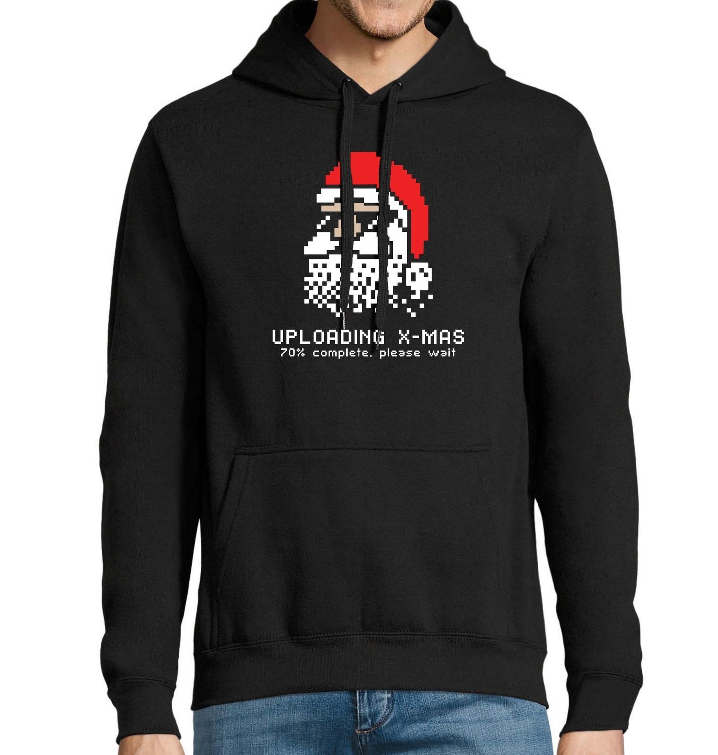 Pánská mikina Pixelový Santa Načítání Vánoc Prosím čekejte. Tento vtipný motiv zobrazuje Santovu hlavu ve stylu 8bit grafiky s nápisem „Uploading X-Mas – 70% Complete, Please Wait“. Ideální dárek pro fanoušky Vánoc, počítačů nebo sarkasmu. Skvělý dárek pro geeky i každého, kdo miluje Vánoce a vánoční atmosféru.