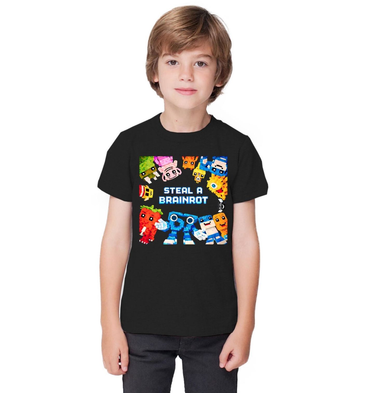 Dětské tričko Pixelový Svět. Barevný herní design s nápisem „Steal a Brainrot“ (Ukradni brainrot / šílenství) představuje skupinu pixelových postaviček v hravém stylu. Tento design evokuje svět videoher, kreativitu a lehce absurdní humor, který osloví fanoušky digitální kultury a moderní zábavy.