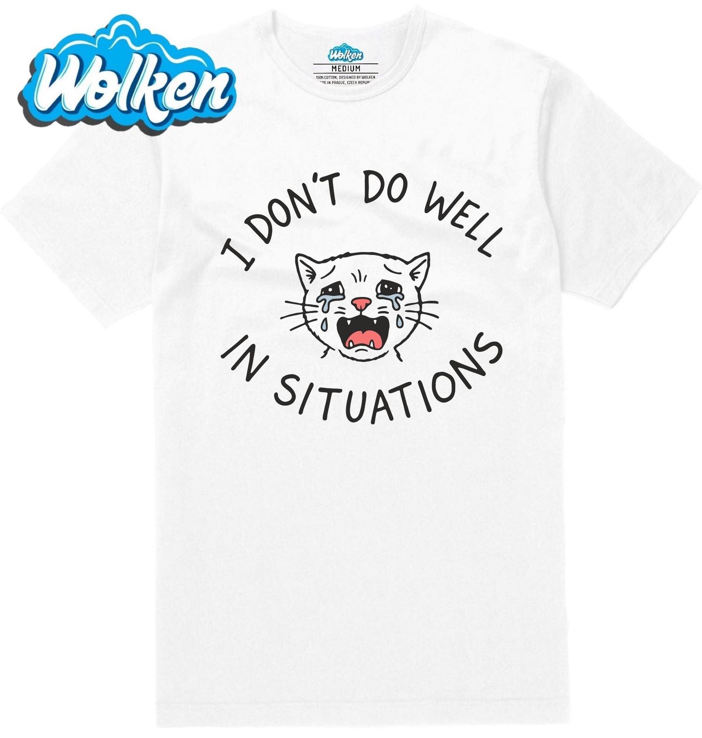 Pánské tričko Plačící Kočka I don't do well in situations. Originální motiv s vtipným a lehce ironickým nápisem "I don't do well in situations" (v překladu: "Nezvládám dobře situace"). Tento motiv kočka v slzách perfektně vystihuje pocit, který občas zažívá každý z nás – ať už jde o společenské situace, pracovní stres nebo prostě jen pondělky.