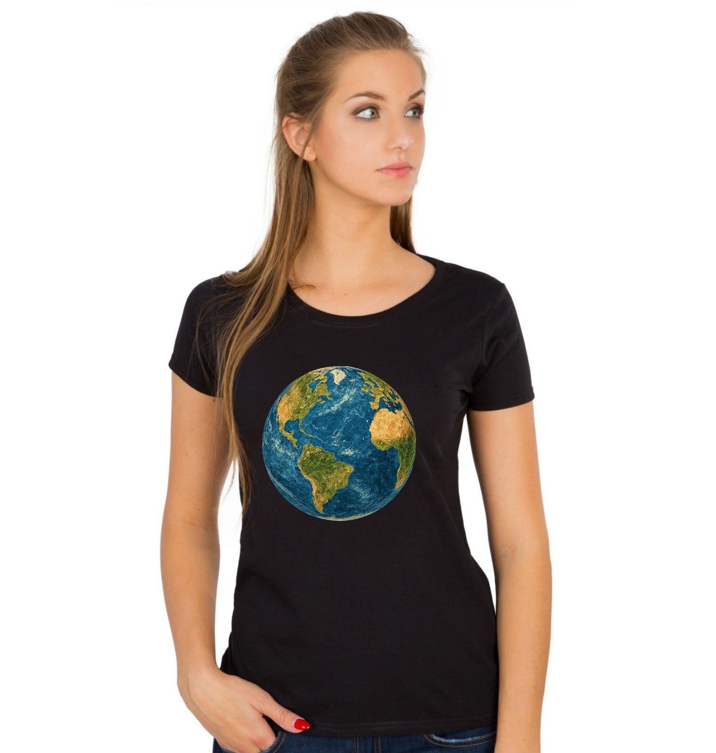 Dámské tričko Planeta Země. Elegantní a detailní motiv, který zobrazuje planeta Země v celé své kráse. Modré oceány, zelené kontinenty a jemná textura povrchu vytvářejí poutavý a realistický pohled na náš domov ve vesmíru. Tento design připomíná, jak je planeta Země jedinečná, křehká a nádherná.
