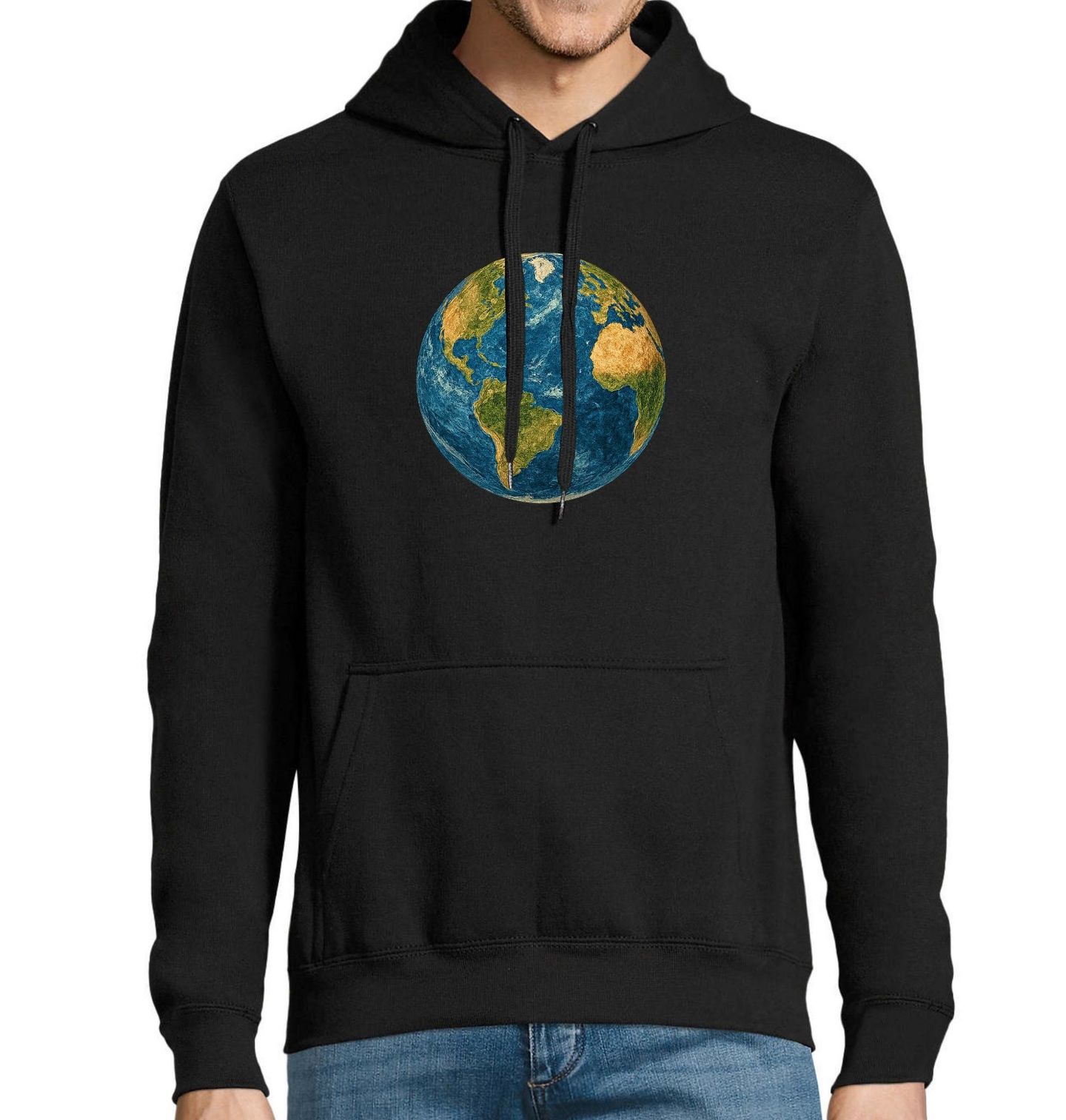 Pánská mikina Planeta Země. Elegantní a detailní motiv, který zobrazuje planeta Země v celé své kráse. Modré oceány, zelené kontinenty a jemná textura povrchu vytvářejí poutavý a realistický pohled na náš domov ve vesmíru. Tento design připomíná, jak je planeta Země jedinečná, křehká a nádherná.