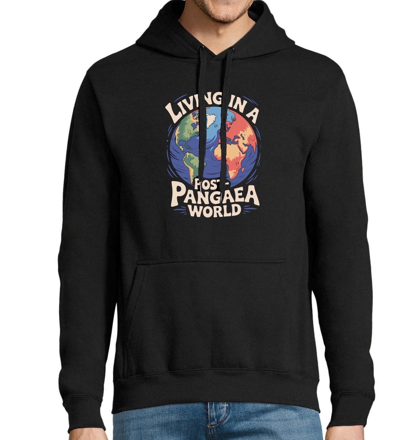 Pánská mikina Planeta Země po Pangee. Living in a Post-Pangaea World = Život ve světě po Pangee. Motiv barevné planety Země zobrazuje současné rozložení kontinentů po rozpadu superkontinentu Pangea, připomíná fascinující vývoj Země a změny, kterými prošla během milionů let. Ideální pro milovníky geografie, geologie a historie naší planety.