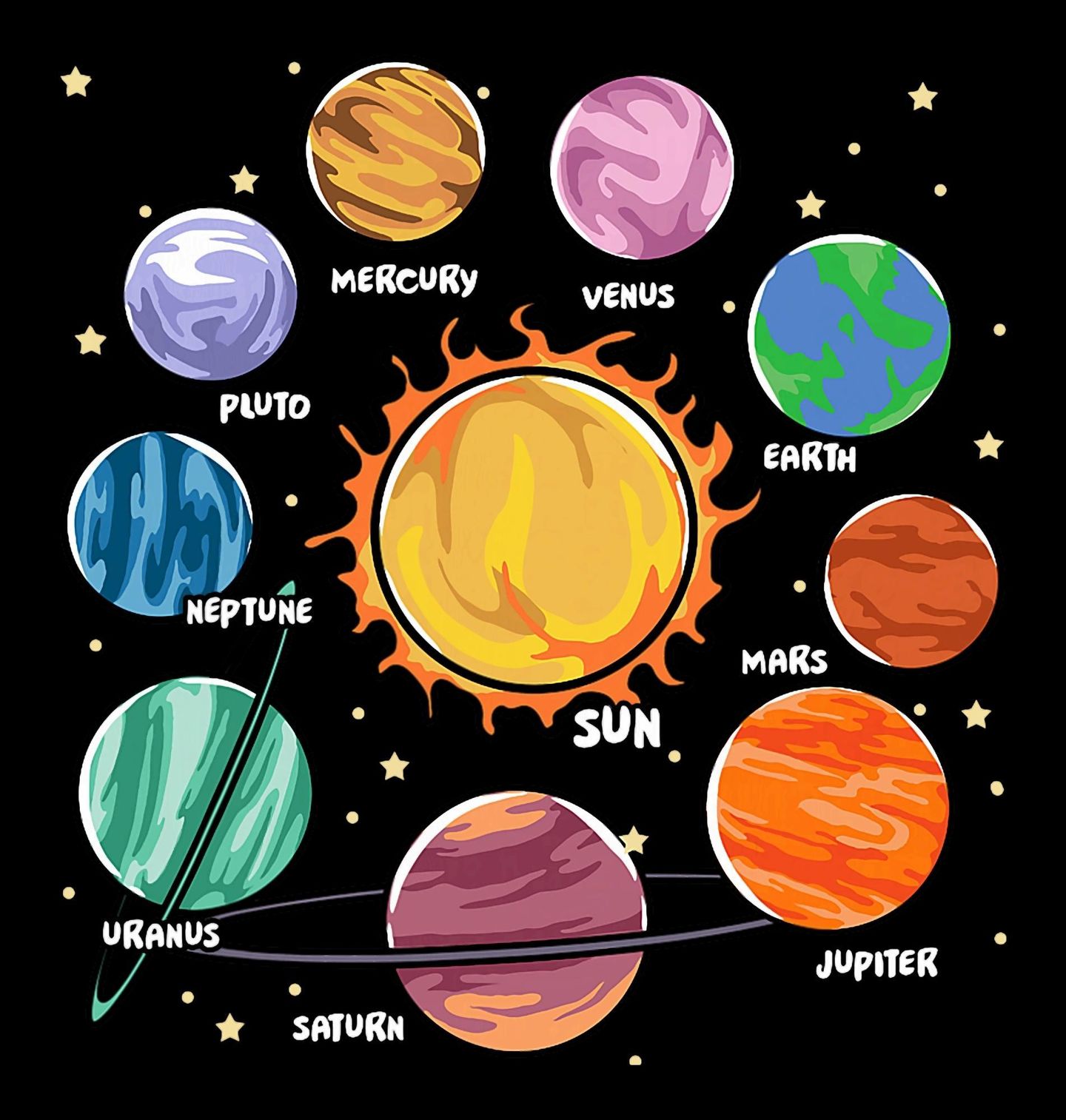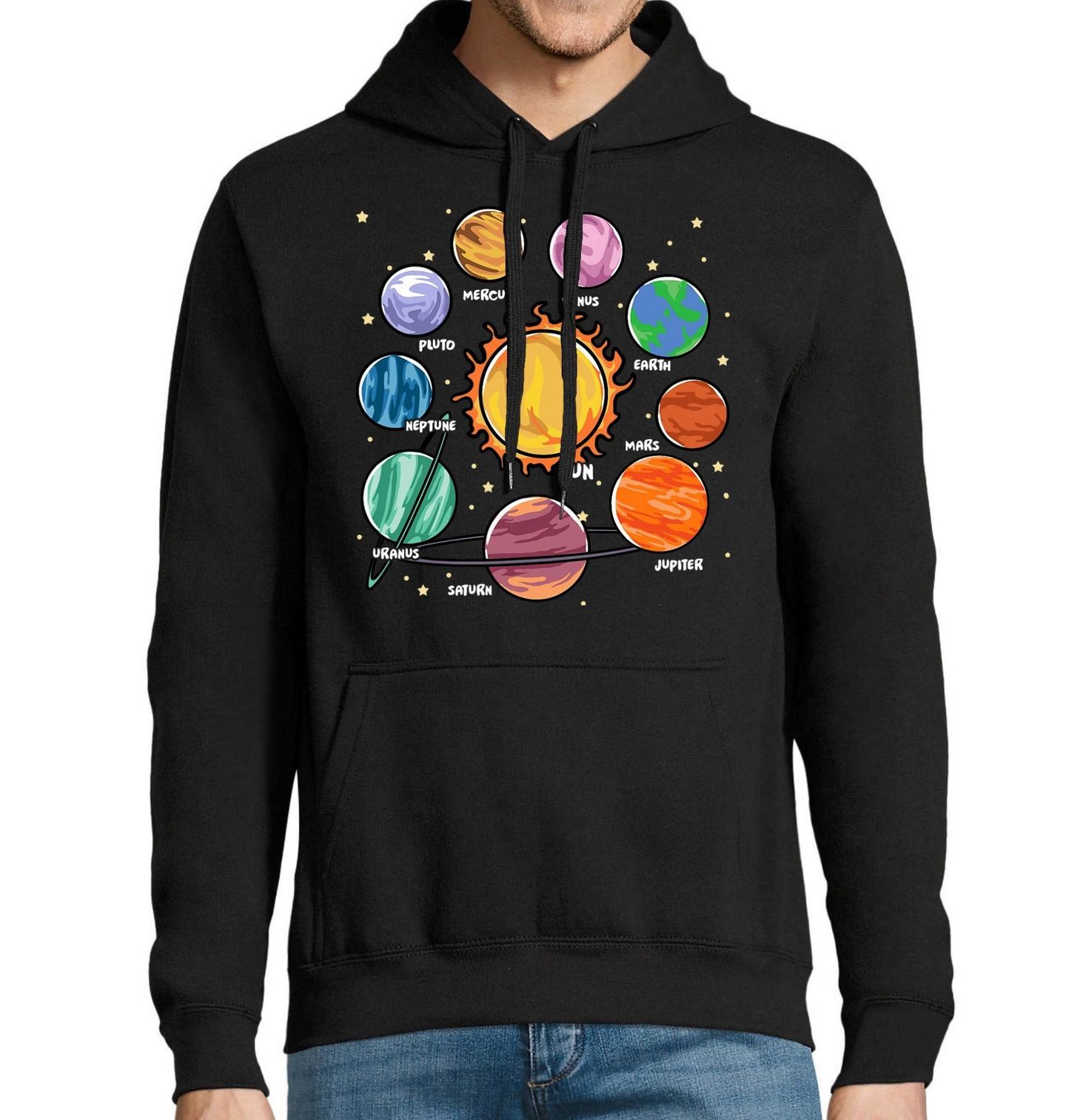 Pánská mikina Planety kolem Slunce. Stylová ilustrace zachycuje sluneční soustavu s planetami včetně Pluta. Kombinuje edukativní prvky s vizuálně atraktivním zpracováním.