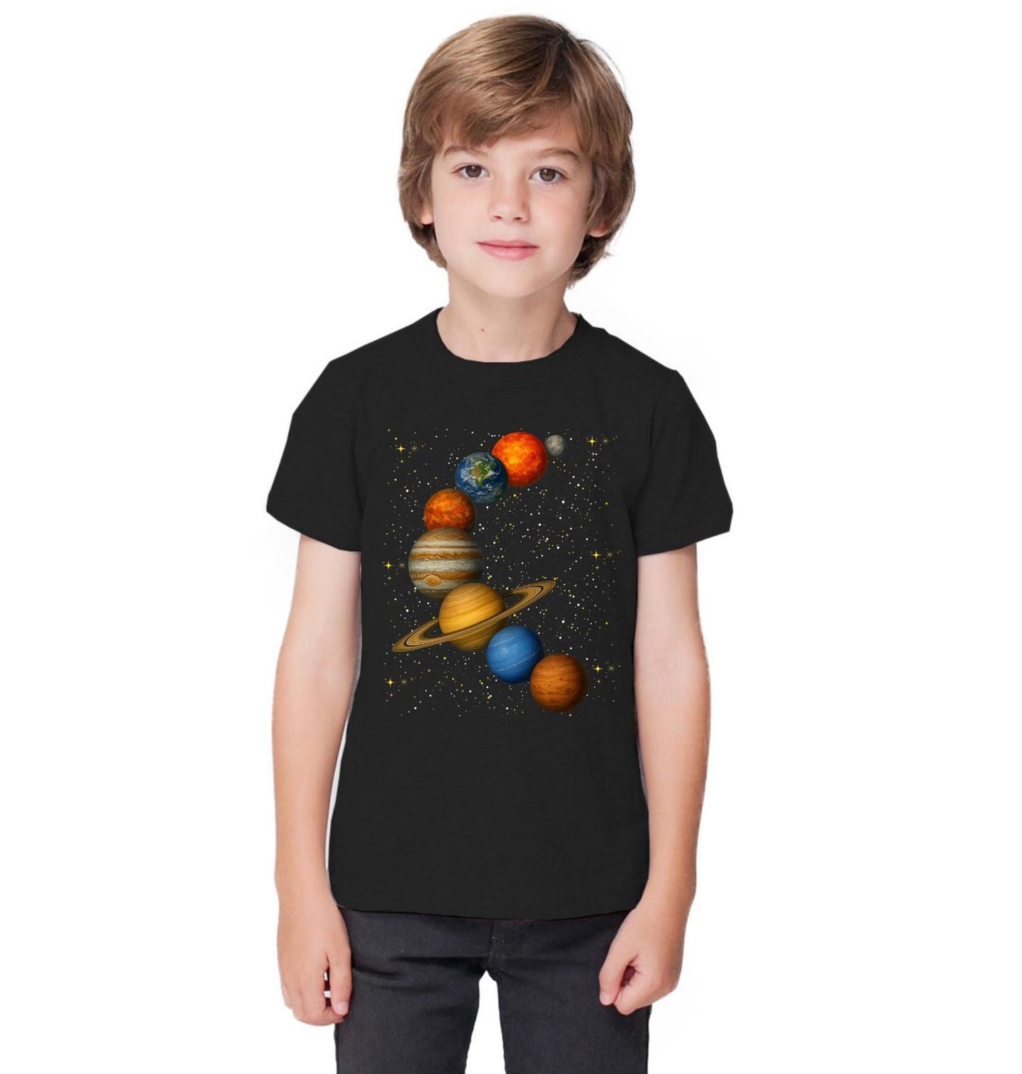 Dětské tričko Planety našeho vesmíru Sluneční soustava. Originální motiv zobrazující planety našeho vesmíru na hvězdném pozadí potěší každého milovníka astronomie, sci-fi i kosmu. Na obrázku jsou krásně vykreslené planety sluneční soustavy: Merkur, Venuše, Země, Mars, Jupiter, Saturn, Uran, Neptun (v pořadí od Slunce).