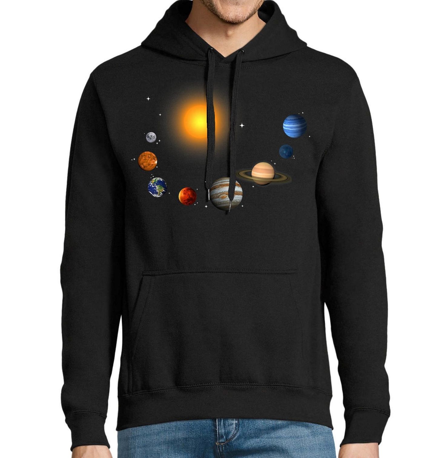 Pánská mikina Planety Sluneční Soustavy. Motiv zobrazuje sluneční soustavu s planetami v realistickém stylu. Perfektní pro milovníky astronomie a vesmíru. Skvělý motiv pro každého, kdo se zajímá o planety, vesmír a galaxii.