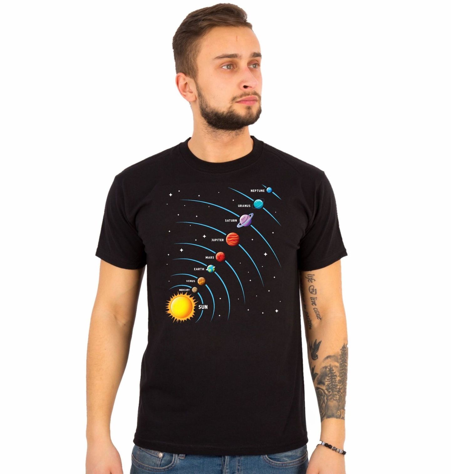 Pánské tričko Planety v Pohybu. Moderní ilustrace zachycuje planety na oběžných drahách kolem Slunce. Popisky jako „Mercury“, „Venus“, „Earth“, „Mars“ a další (Merkur, Venuše, Země, Mars…) dodávají přehlednost a vzdělávací hodnotu. Skvělé pro fanoušky astronomie a vědeckých témat.