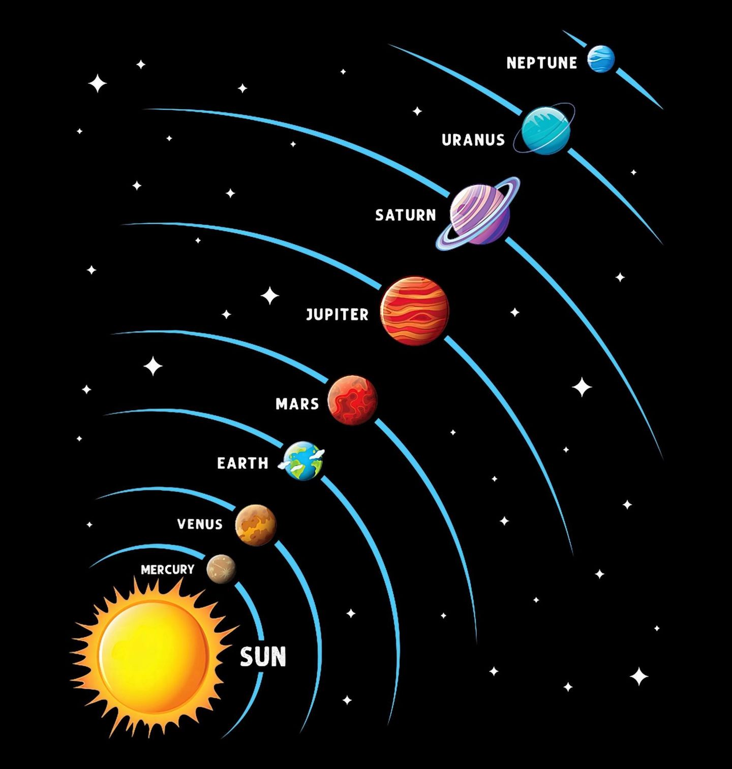 Dámské tričko Planety v Pohybu. Moderní ilustrace zachycuje planety na oběžných drahách kolem Slunce. Popisky jako „Mercury“, „Venus“, „Earth“, „Mars“ a další (Merkur, Venuše, Země, Mars…) dodávají přehlednost a vzdělávací hodnotu. Skvělé pro fanoušky astronomie a vědeckých témat.