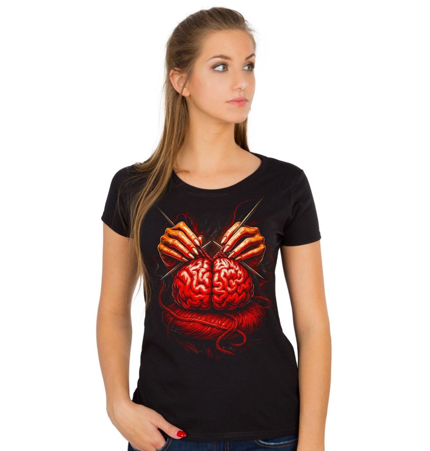 Dámské tričko Pletený Mozek. Originální a lehce provokativní motiv zobrazuje mozek jako klubko příze, které je postupně tvořeno rukama pomocí jehlic. Tento vizuál symbolizuje myšlení, kreativitu a proces, při kterém se rodí nápady i emoce. Mozek zde není jen orgán, ale dynamický prostor, kde vzniká realita. Motiv spojuje temnou estetiku s metaforou tvorby – pletení představuje skládání myšlenek, budování osobnosti a nekonečný proces učení.