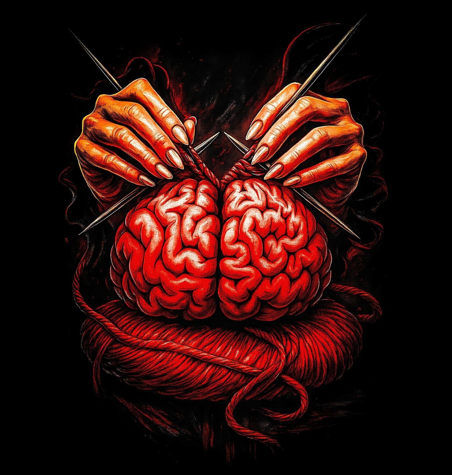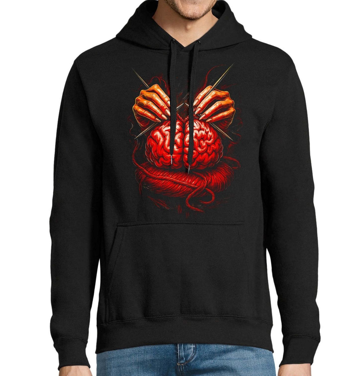 Pánská mikina Pletený Mozek. Originální a lehce provokativní motiv zobrazuje mozek jako klubko příze, které je postupně tvořeno rukama pomocí jehlic. Tento vizuál symbolizuje myšlení, kreativitu a proces, při kterém se rodí nápady i emoce. Mozek zde není jen orgán, ale dynamický prostor, kde vzniká realita. Motiv spojuje temnou estetiku s metaforou tvorby – pletení představuje skládání myšlenek, budování osobnosti a nekonečný proces učení.