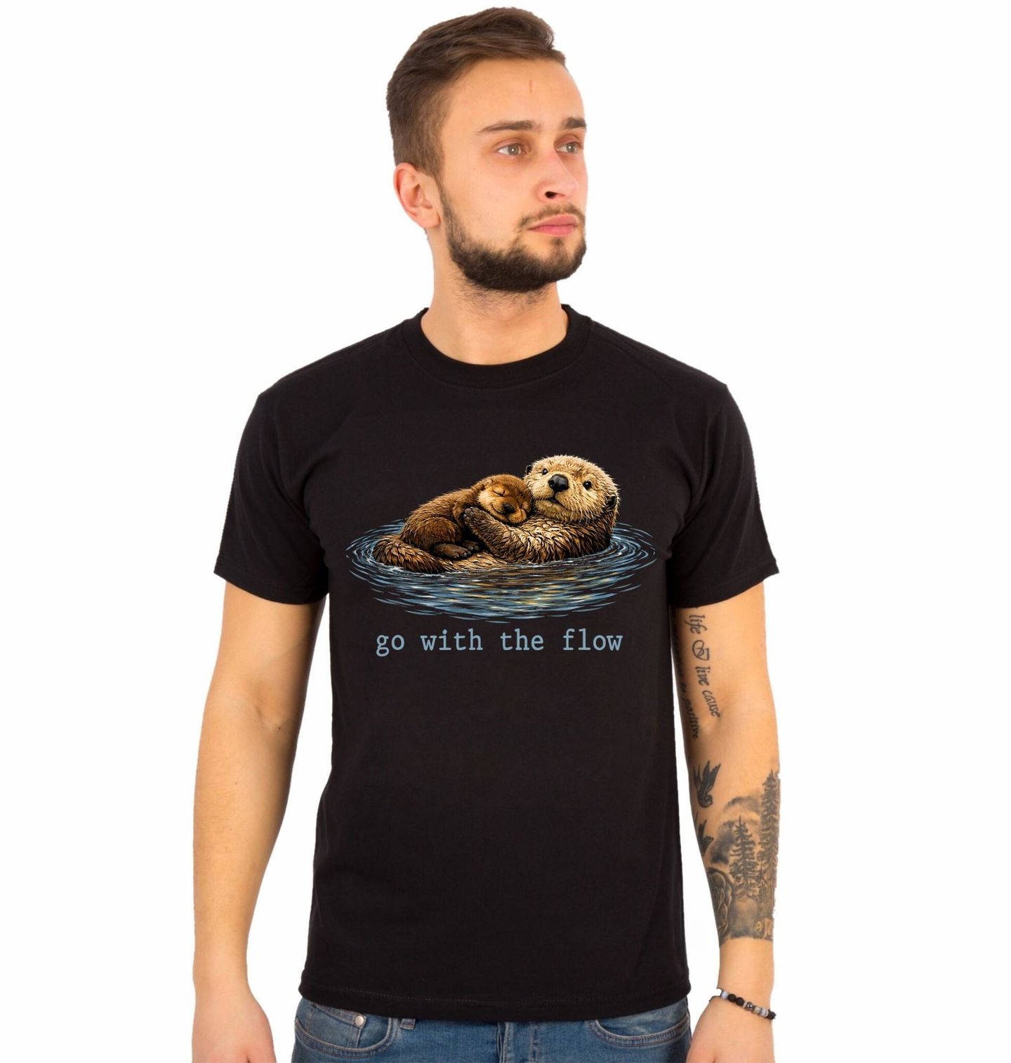 Pánské tričko Plovoucí Mořské Vydry Go with the flow. Roztomilý motiv s tématem vydra, který zachycuje klid, pohodu a lásku. Dvě vydry se vznášejí na vodě, jedna spokojeně odpočívá v náručí druhé – dokonalý symbol klidu a bezpečí. "Go with the flow" česky nech to plynout / jdi s proudem.