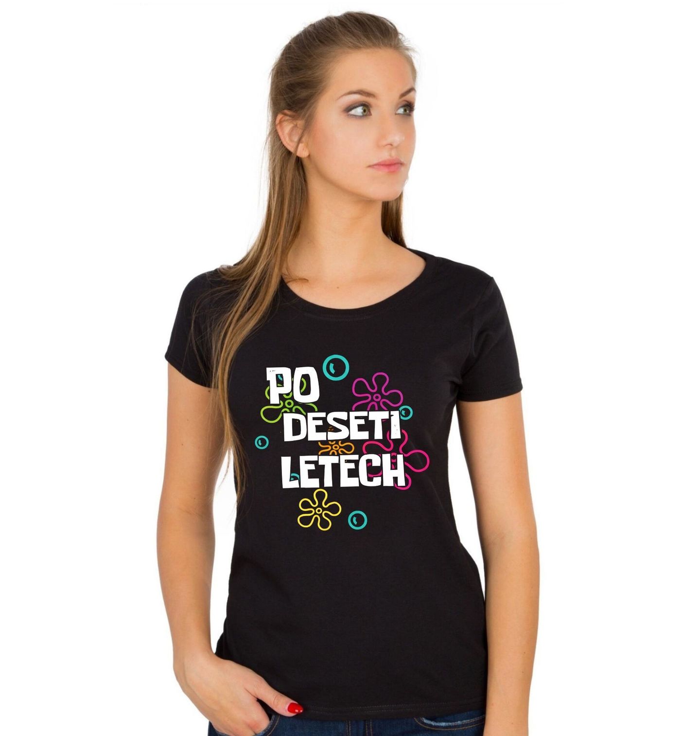 Dámské tričko Po deseti letech Bublinkový přechod. Tento hravý motiv s výrazným nápisem „Po deseti letech“ je ideální pro každé kulaté výročí nebo vtipně pojaté narozeniny. Design doplňují barevné grafické prvky v retro stylu, které motivu dodávají lehkost a humor.
