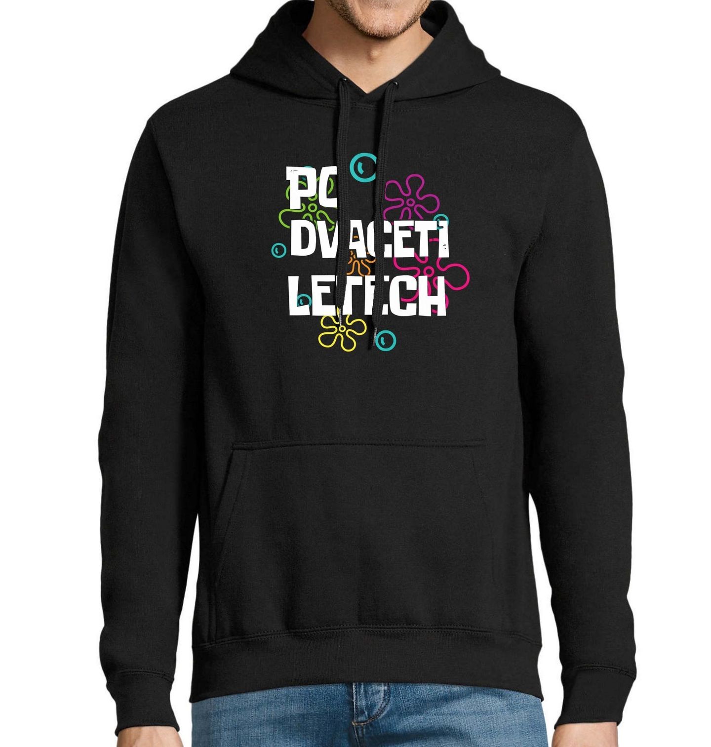 Pánská mikina Po dvaceti letech Bublinkový přechod. Tento veselý motiv s výrazným nápisem „Po dvaceti letech“ je jako stvořený pro každé kulaté výročí nebo originální narozeniny. Barevné grafické prvky v pozadí připomínají hravý retro styl a dodávají designu lehkost a humor.
