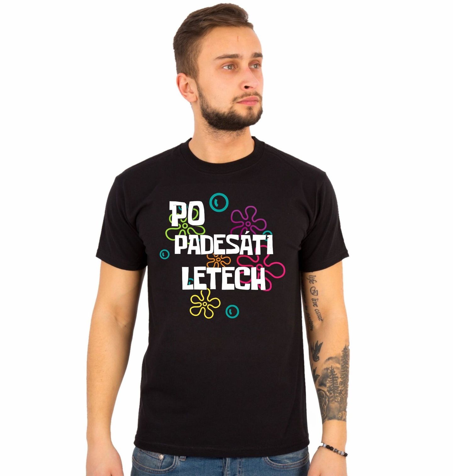 Pánské tričko Po padesáti letech Bublinkový přechod. Tento originální potisk s výrazným nápisem „Po padesáti letech“ je ideální pro padesáté výročí nebo kulaté narozeniny. Na tmavém podkladu vynikají barevné retro květinové a bublinové prvky, které motivu dodávají hravý a pozitivní styl.