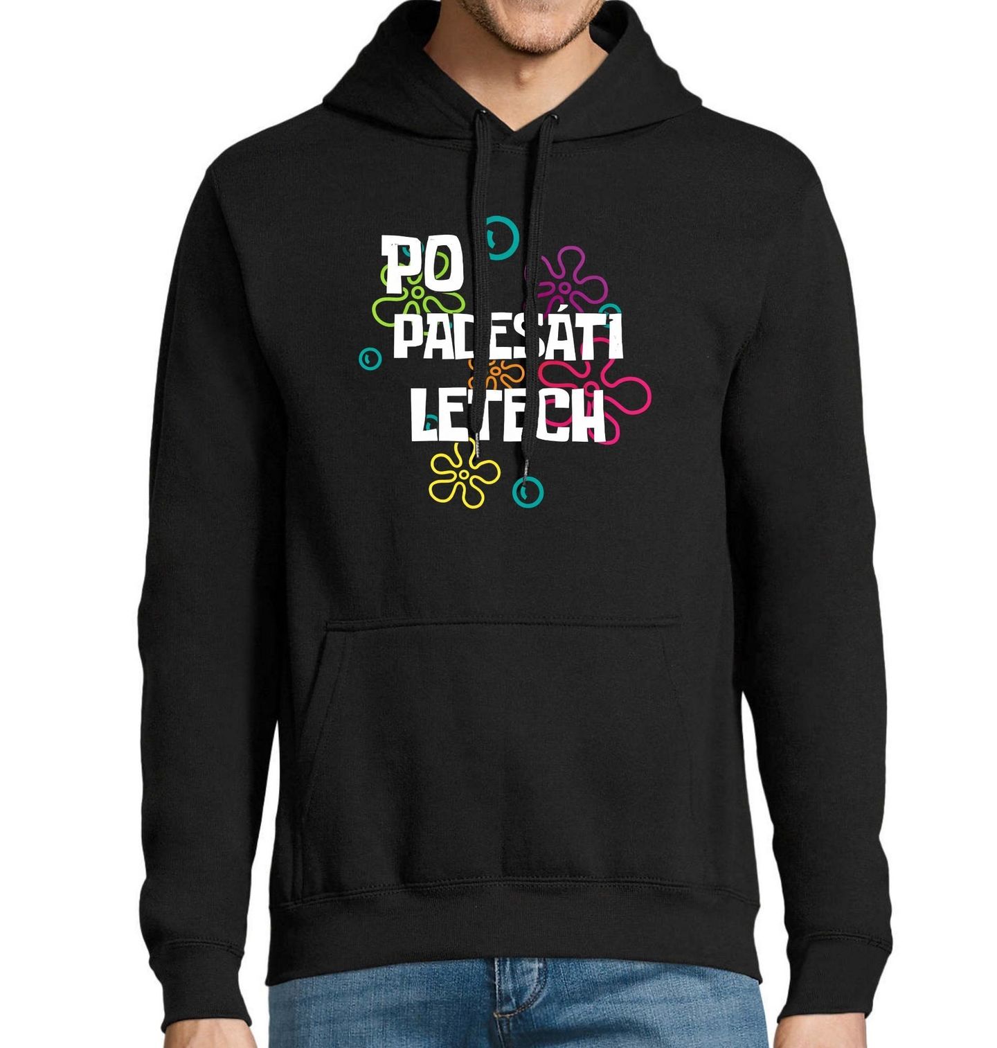 Pánská mikina Po padesáti letech Bublinkový přechod. Tento originální potisk s výrazným nápisem „Po padesáti letech“ je ideální pro padesáté výročí nebo kulaté narozeniny. Na tmavém podkladu vynikají barevné retro květinové a bublinové prvky, které motivu dodávají hravý a pozitivní styl.