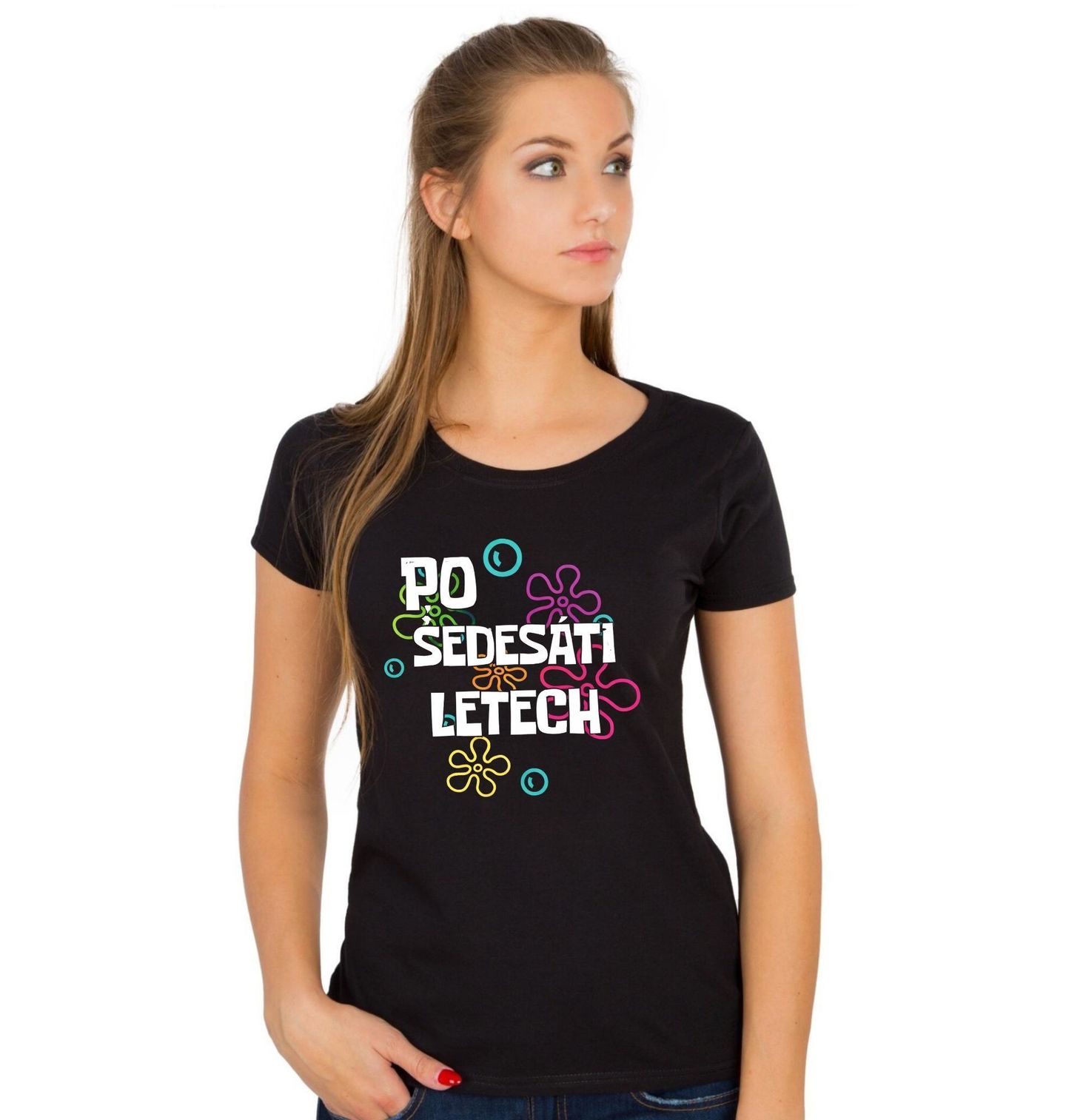 Dámské tričko Po šedesáti letech Bublinkový přechod. Tento veselý potisk s výrazným nápisem „Po šedesáti letech“ je jako stvořený pro šedesáté výročí nebo kulaté narozeniny. Barevné květinové a bublinové prvky na tmavém pozadí dodávají motivu hravý, pozitivní a mladistvý vzhled.