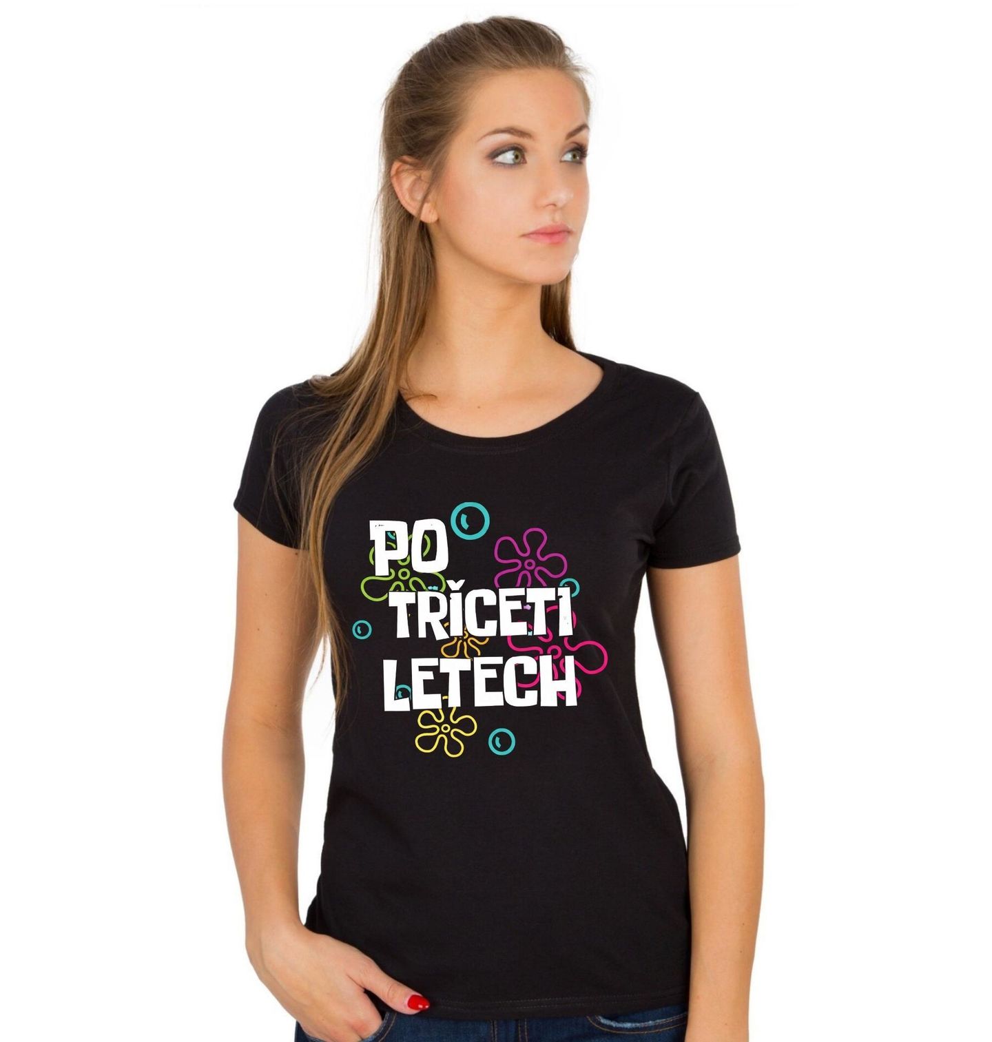 Dámské tričko Po třiceti letech Bublinkový přechod. Tento výrazný a hravý motiv s nápisem „Po třiceti letech“ je jako dělaný pro třicáté výročí nebo kulaté narozeniny. Barevné květinové a bublinové prvky v pozadí dodávají designu veselý a odlehčený styl, takže působí moderně i retro zároveň.