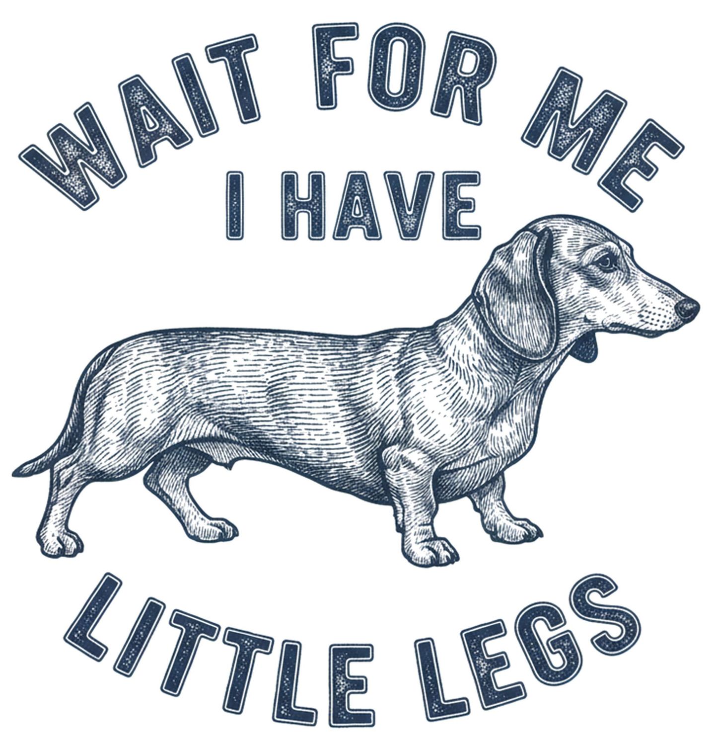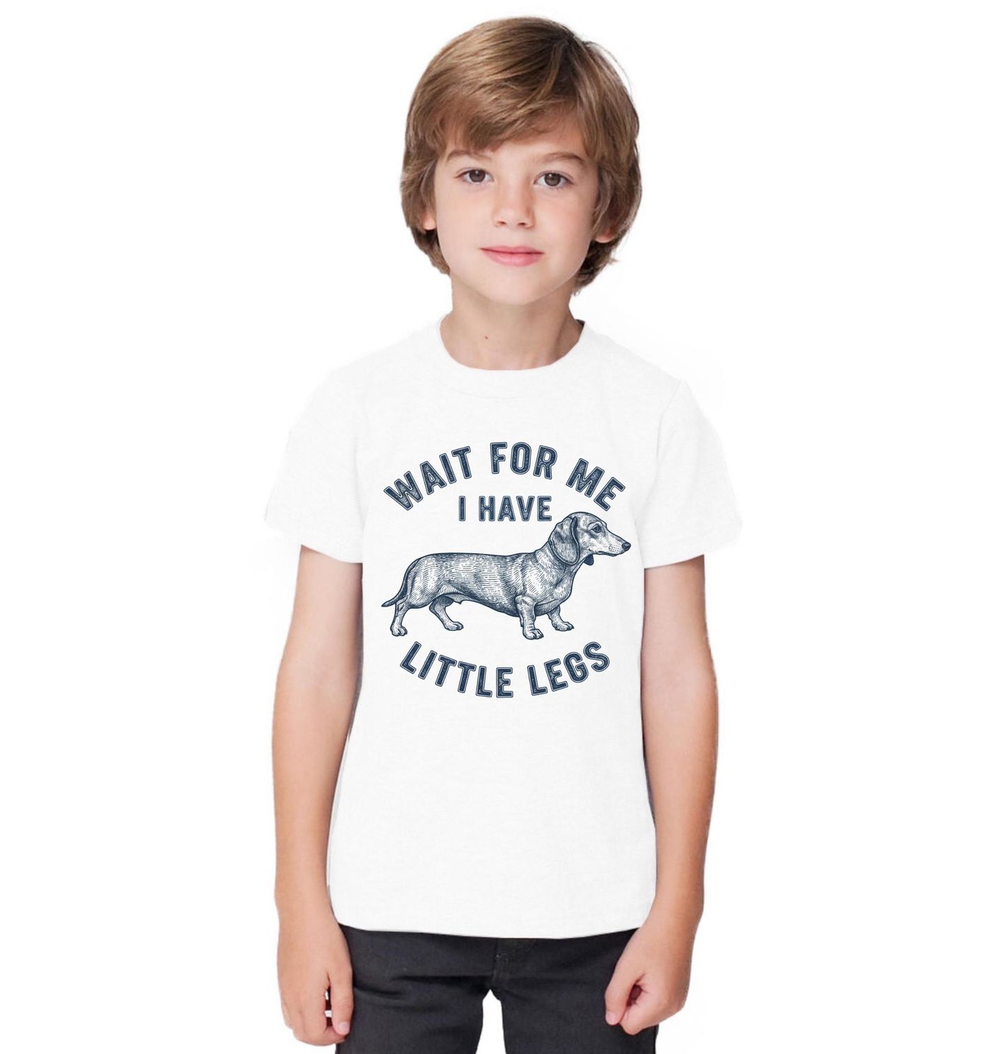 Dětské tričko Počkej na Mě Mám Krátké Nožky. Stylový design s motivem psa plemene jezevčík a textem „WAIT FOR ME I HAVE LITTLE LEGS“ (Počkej na mě, mám krátké nožky) je ideální pro všechny milovníky psů. Detailní ilustrace jezevčíka v retro stylu dodává motivu jedinečný vzhled. Tento design skvěle vystihuje roztomilost a osobnost malých plemen.