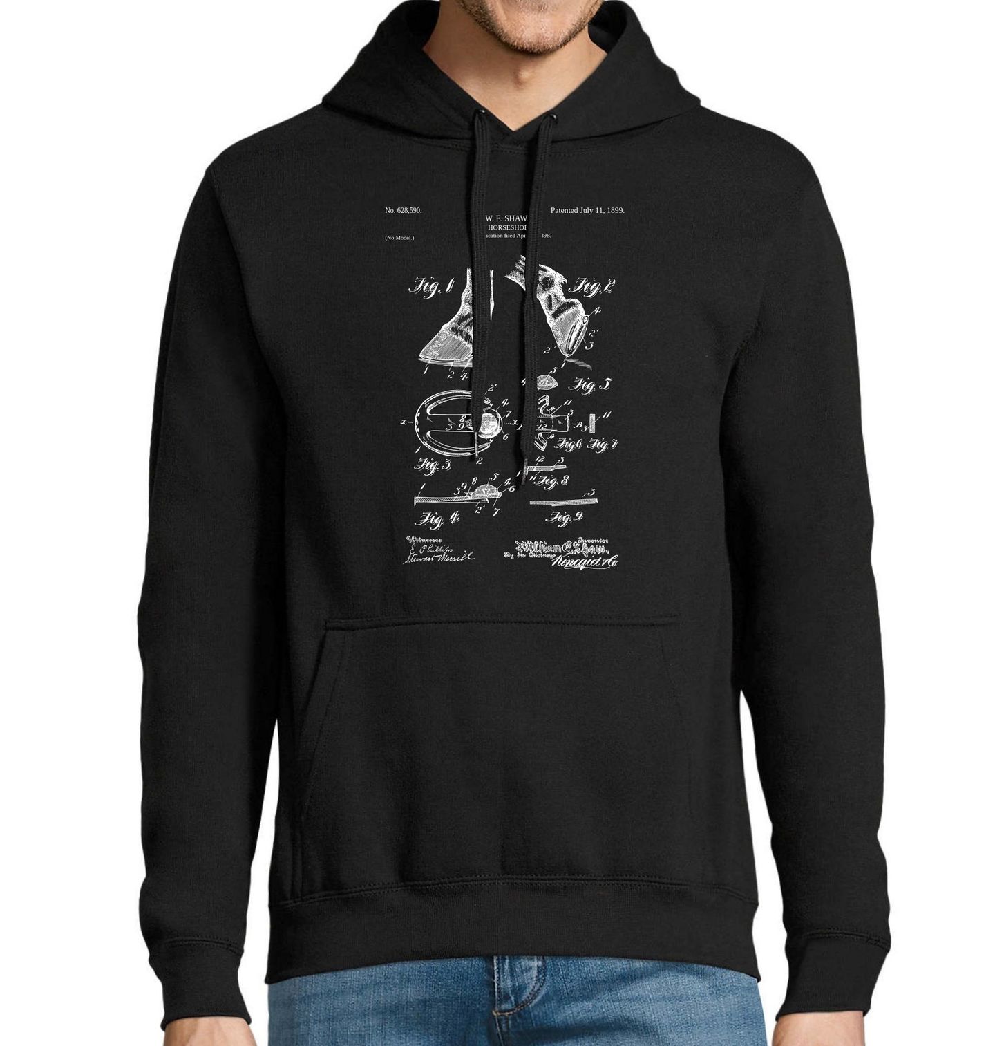 Pánská mikina Podkova Patent W. E. Shaw. Originální tričko s motivem historického patentu na podkovu od vynálezce Williama E. Shawa z roku 1899. Patent č. 628,590 představuje inovativní řešení pro ochranu a upevnění podkovy na kopyto koně. Tento precizní výkres je skvělým designovým prvkem pro všechny milovníky koní, kovářství, historie nebo technického umění.