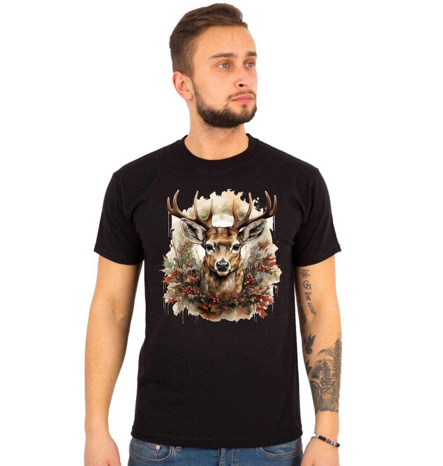 Pánské tričko Podzimní Jelen. Motiv jelení hlavy s mohutnými parohy, obklopené lesními větvičkami, bobulemi a podzimními květinami, je poctou přírodě, klidu a divoké kráse. Tento design osloví milovníky lesa, zvířat i stylového přírodního umění. Hodí se jako dárek pro myslivce, lesní duše nebo každého, kdo miluje podzimní atmosféru.