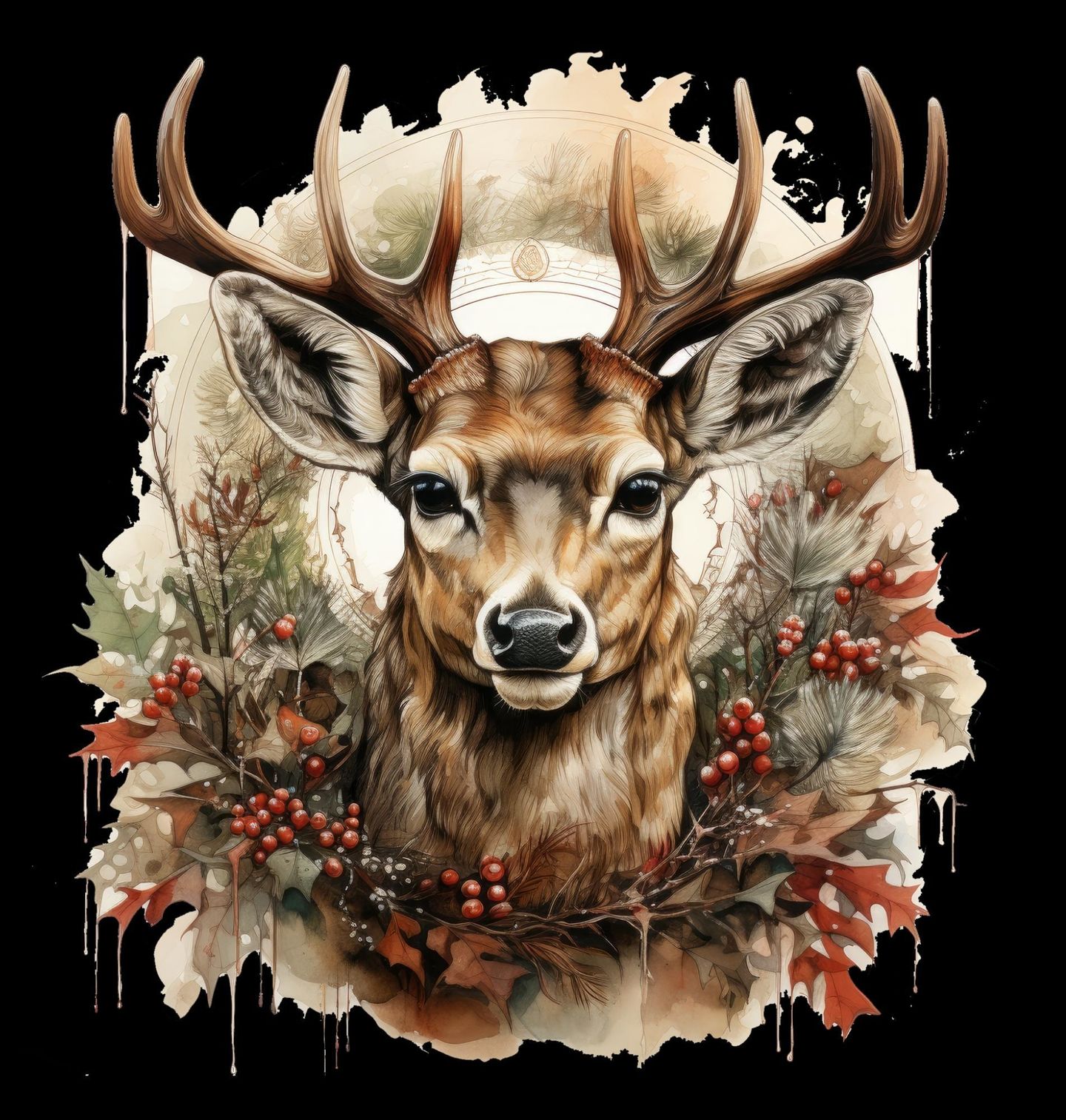 Dámské tričko Podzimní Jelen. Motiv jelení hlavy s mohutnými parohy, obklopené lesními větvičkami, bobulemi a podzimními květinami, je poctou přírodě, klidu a divoké kráse. Tento design osloví milovníky lesa, zvířat i stylového přírodního umění. Hodí se jako dárek pro myslivce, lesní duše nebo každého, kdo miluje podzimní atmosféru.