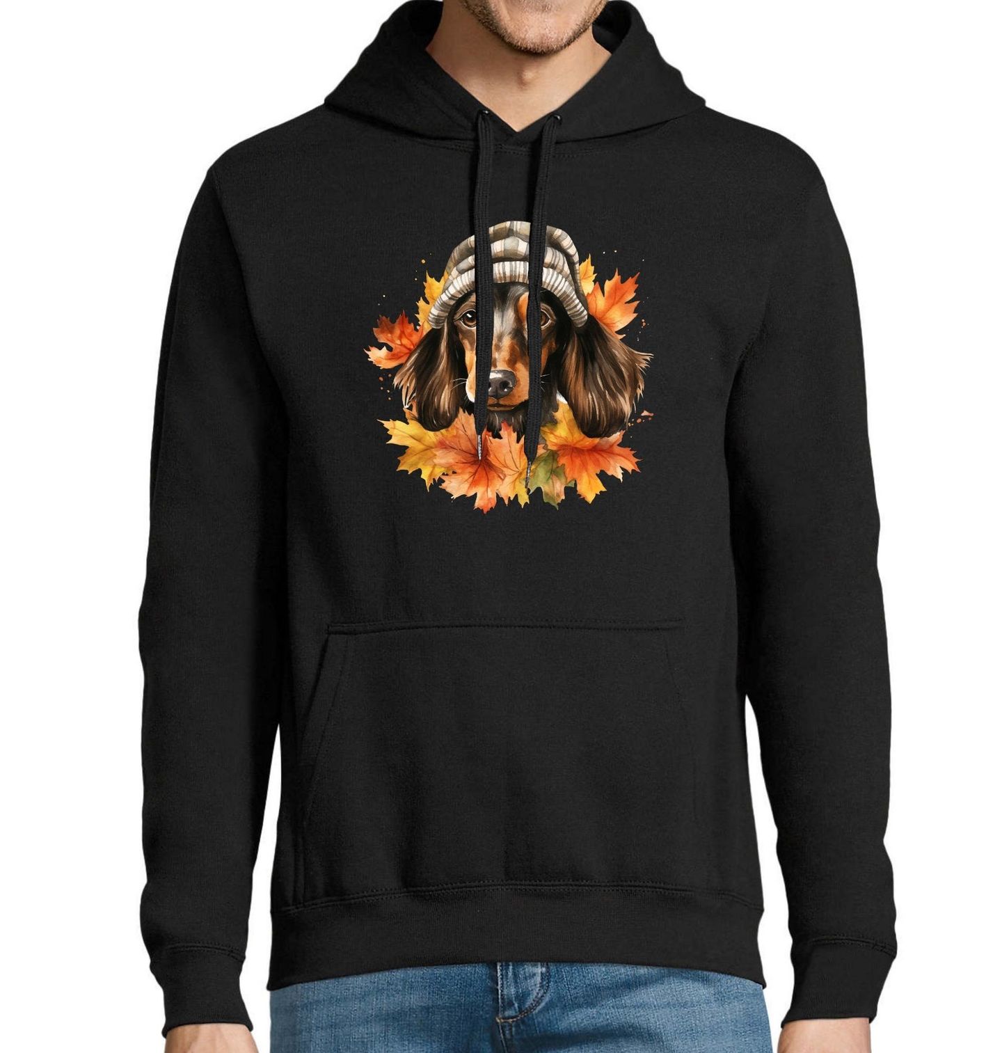 Pánská mikina Podzimní Jezevčík v Listí. Jezevčík v podzimní čepici obklopený barevný listím je ideálním kouskem pro každého, kdo miluje pes a kouzlo podzimu. Stylový a hřejivý design rozveselí nejen každého pejskaře, ale i okolí během sychravých dní. Ideální jako dárek pro milovníky plemene jezevčík nebo jako útulný doplněk na procházky v listí.