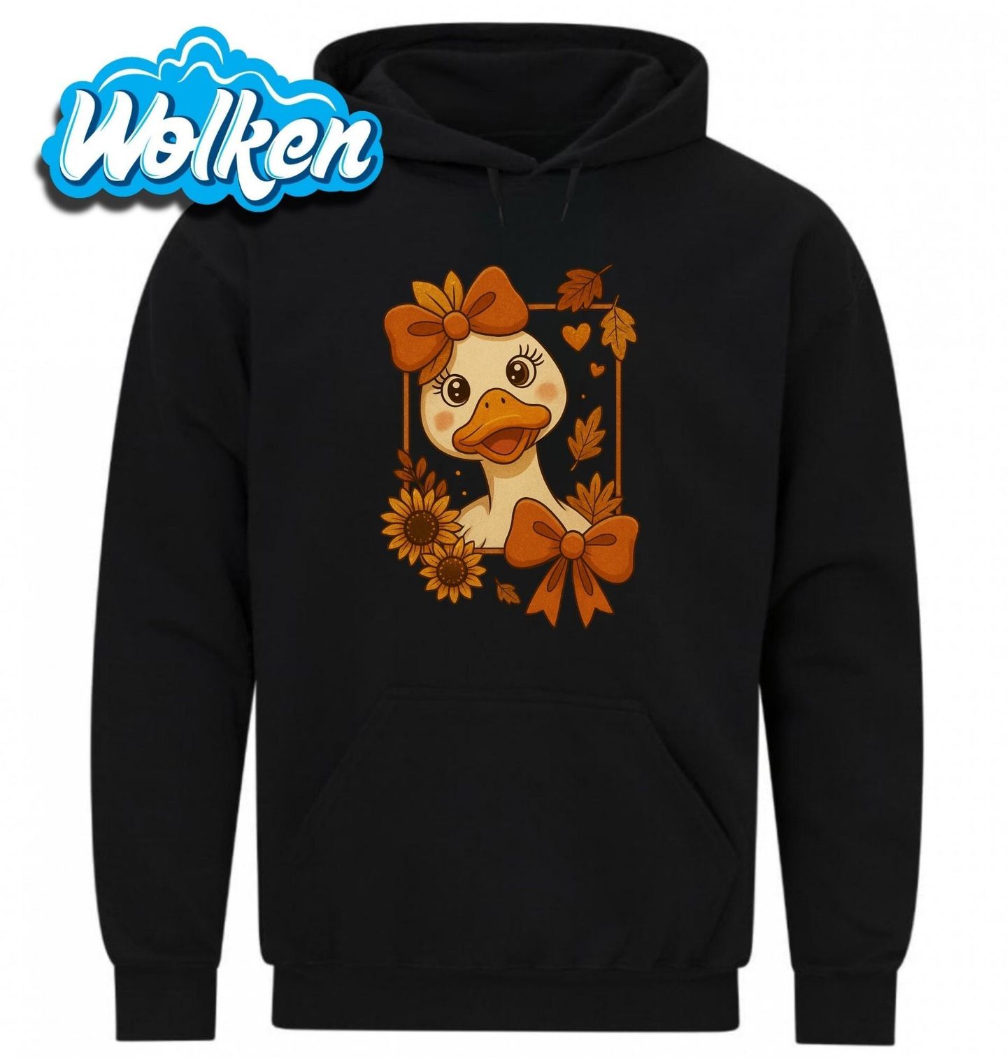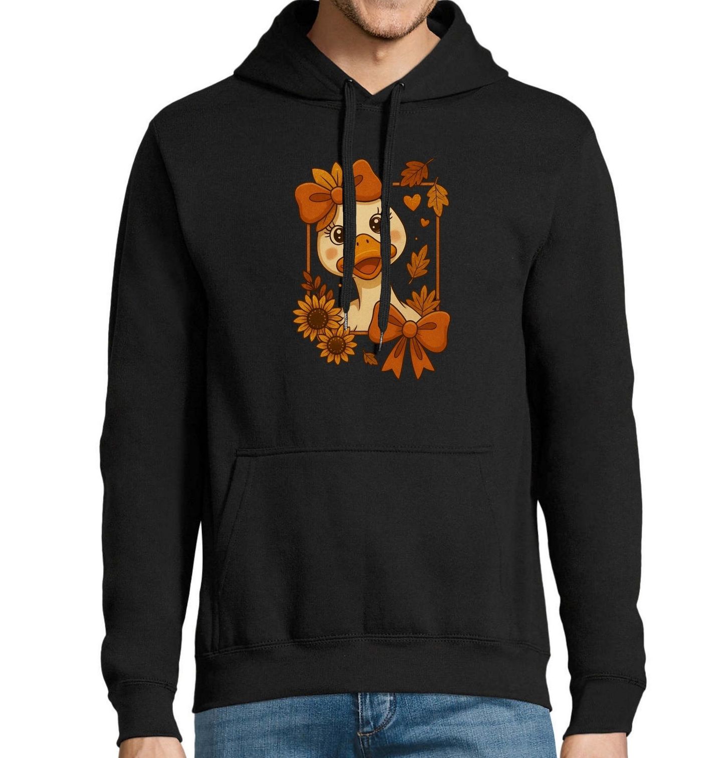 Pánská mikina Podzimní Kachna. Hlavní hrdinkou je kachnička s velkou mašlí, obklopená květinami – především slunečnicemi – a podzimními listy v teplých tónech oranžové a hnědé. Ideální dárek pro milovníky zvířátek, přírody a hravého stylu.