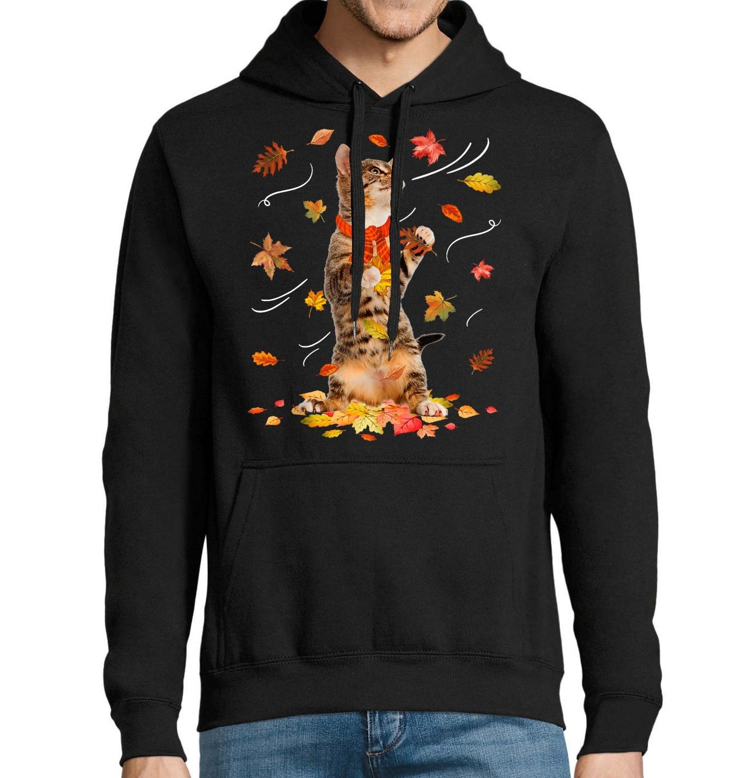 Pánská mikina Podzimní Kočka. Roztomilá kočka v šále si hraje s barevným podzimním listím, které poletuje kolem ní. Teplé barvy a dynamika pohybu vytvářejí příjemnou podzimní atmosféru. Ideální motiv pro milovníky podzimu a koček.