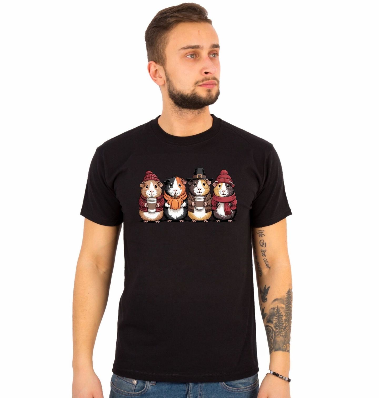 Pánské tričko Podzimní Morčata. Roztomilý podzimní motiv, který spojuje vše, co milujete – morče, hlodavec, latte, dýně a huňaté svetry! Čtyři stylová morčata v podzimních outfitech s teplým nápojem v tlapkách vám zpříjemní každý chladný den. Morče je nejen oblíbený hlodavec, ale taky stylová ikona této podzimní sezóny!