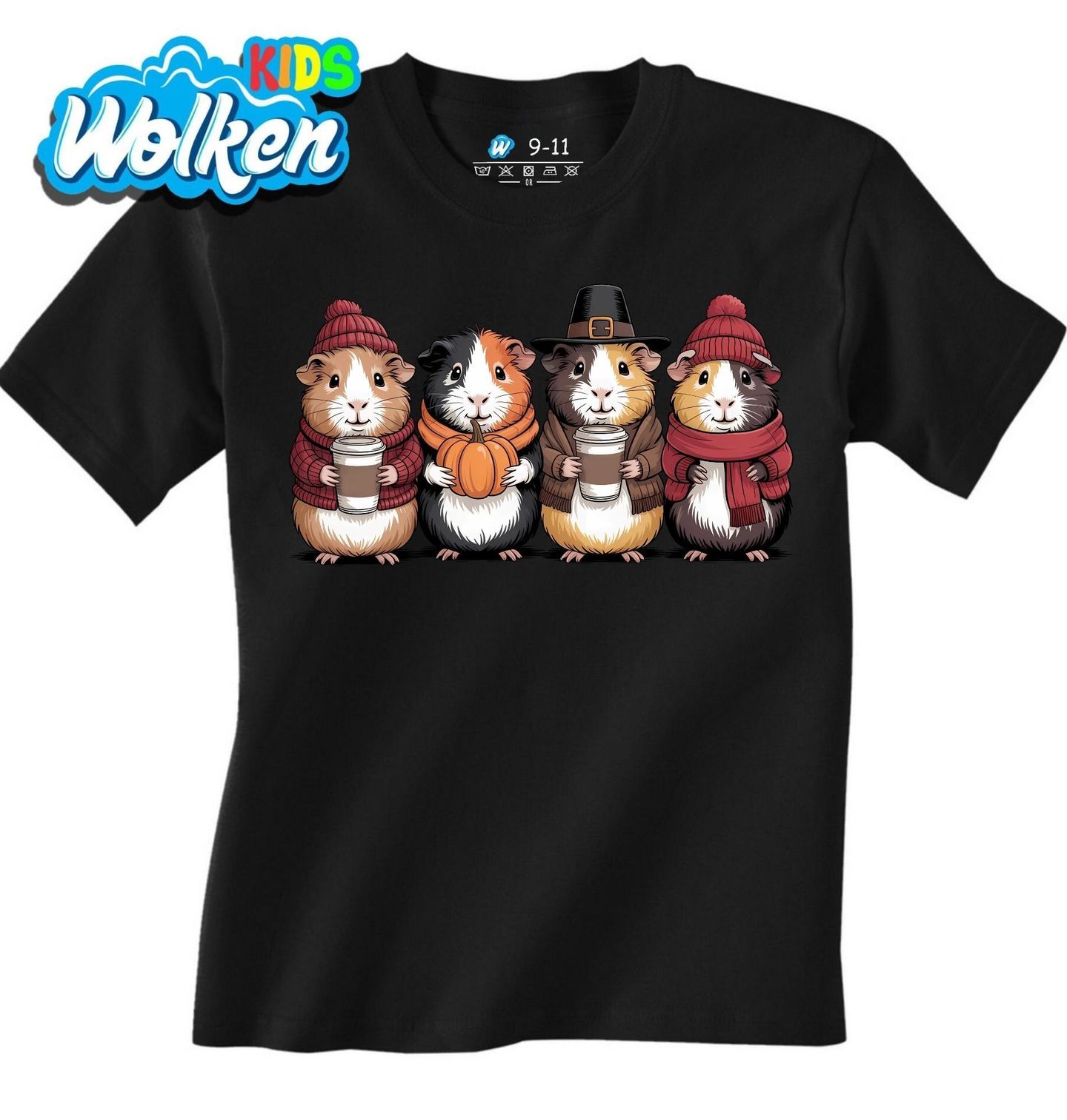 Dětské tričko Podzimní Morčata. Roztomilý podzimní motiv, který spojuje vše, co milujete – morče, hlodavec, latte, dýně a huňaté svetry! Čtyři stylová morčata v podzimních outfitech s teplým nápojem v tlapkách vám zpříjemní každý chladný den. Morče je nejen oblíbený hlodavec, ale taky stylová ikona této podzimní sezóny!