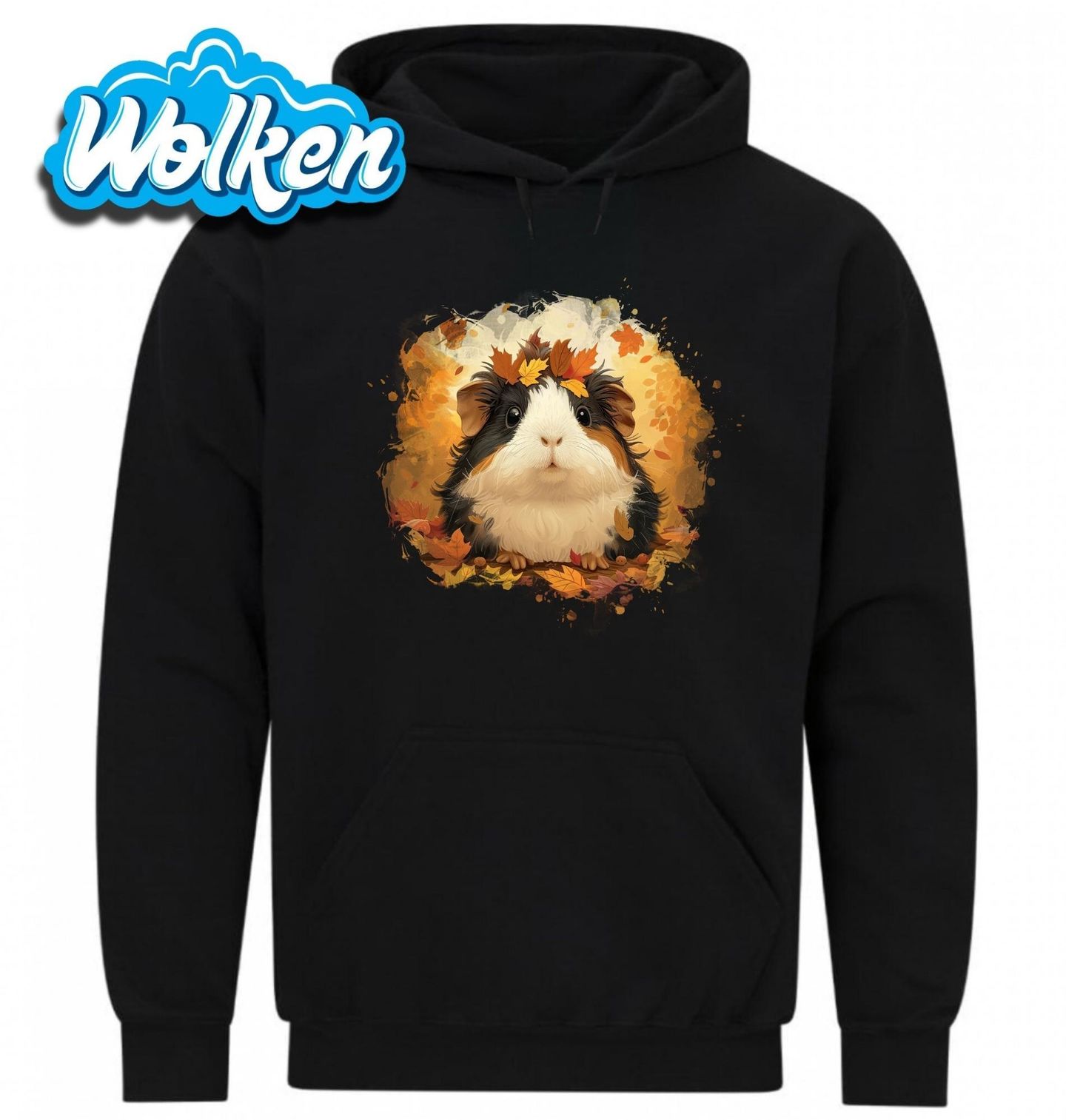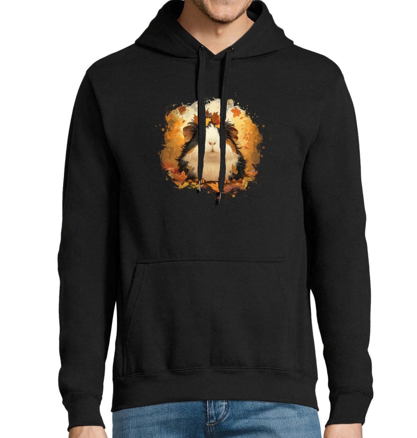 Pánská mikina Podzimní Morče v Listí. Rozkošný hlodavec s korunou z barevného podzimního listí, zasazené do teplého podzimního pozadí plného zlatých, oranžových a červených tónů. Ideální pro všechny, kdo milují zvířátka, podzimní atmosféru a hebká morčata.