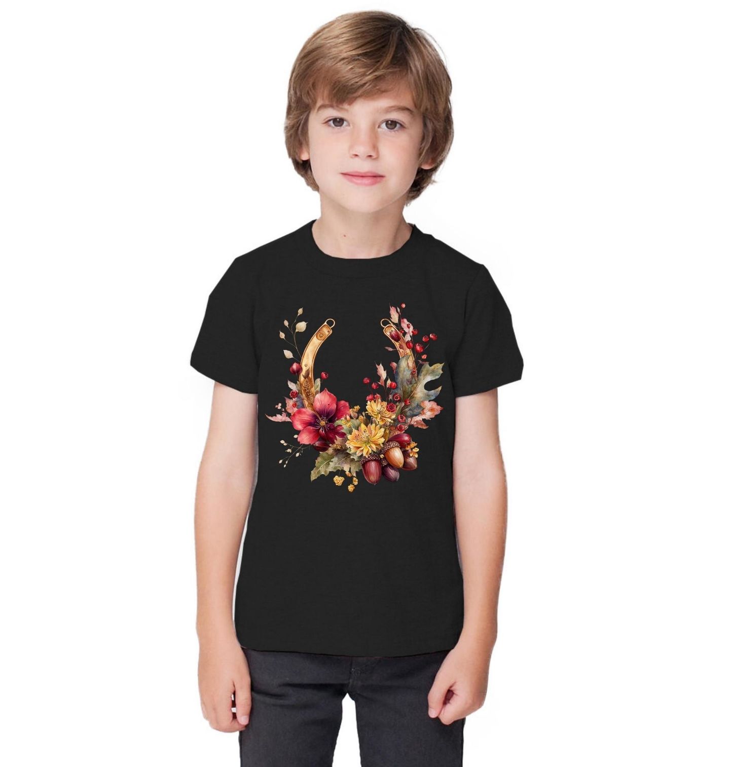 Dětské tričko Podzimní Podkova Štěstí. Elegantní ilustrace spojuje symbol štěstí, který představuje podkova, s jemným motivem kůň a přírodní krásou, kterou doplňují květiny, listy a žaludy v podzimních barvách. Design působí romanticky a zároveň rustikálně, takže je ideální pro milovníky koní, přírody i venkovského stylu.