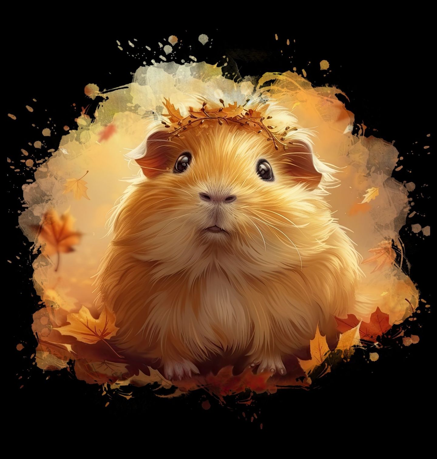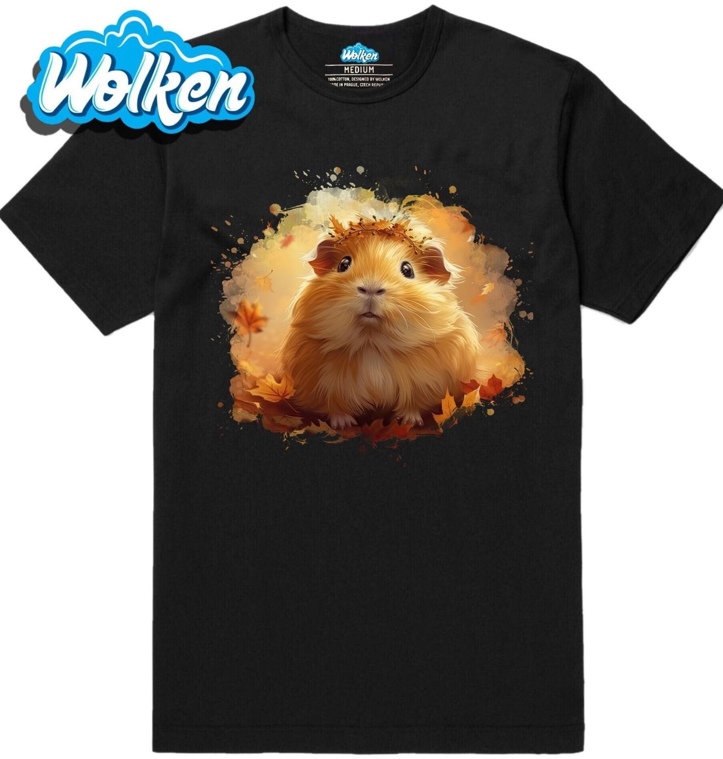 Pánské tričko Podzimní Zrzavé Morče. Podzimní morče je dokonalou kombinací roztomilosti a podzimní atmosféry. Huňaté morče sedí uprostřed listí a na hlavě má korunku z podzimních větviček – ideální pro všechny milovníky zvířat a podzimu.