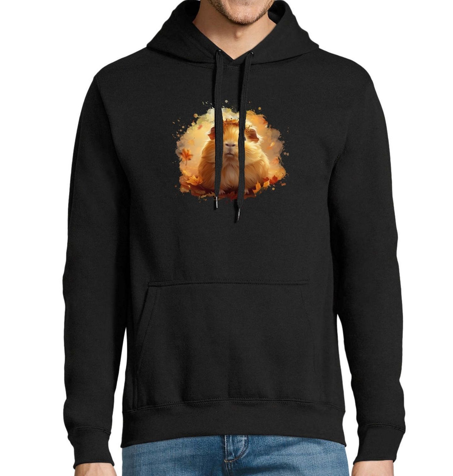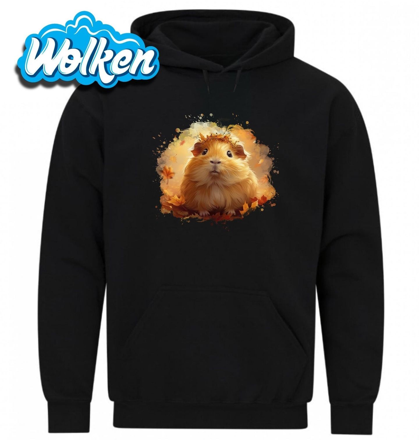 Pánská mikina Podzimní Zrzavé Morče. Podzimní morče je dokonalou kombinací roztomilosti a podzimní atmosféry. Huňaté morče sedí uprostřed listí a na hlavě má korunku z podzimních větviček – ideální pro všechny milovníky zvířat a podzimu.