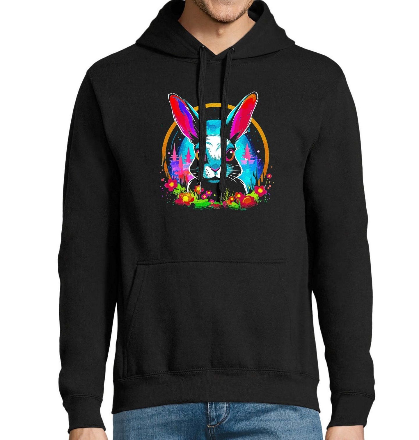 Pánská mikina Pohádkový Králík v Ráji Květin. Originální tričko s výrazným designem králíka obklopeného květinami je jako stvořené pro milovníky přírody, zvířat a barevného stylu. Zářivé barvy, pohádkové pozadí a jemné květinové detaily vytvářejí magickou atmosféru, která zaujme na první pohled.