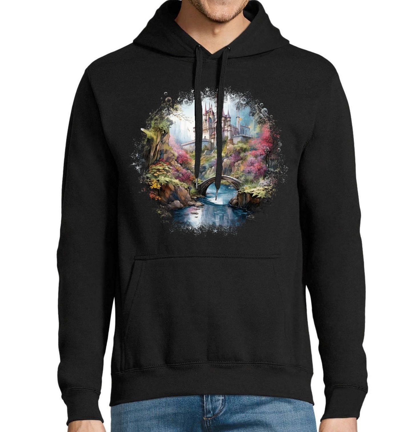 Pánská mikina Pohádkový Zámek. Tento jemný a detailní motiv zachycuje zámek ukrytý v kouzelné krajině plné barevných stromů, květin a klidné vody. Kamenný most vedoucí přes říčku působí jako vstupní brána do jiného světa, kde se čas zpomaluje a fantazie ožívá. Ilustrace představuje království, ve kterém vládne magie, příroda a staré příběhy. Každý detail působí jako vystřižený z klasické knížky, kterou si pamatujeme z dětství.