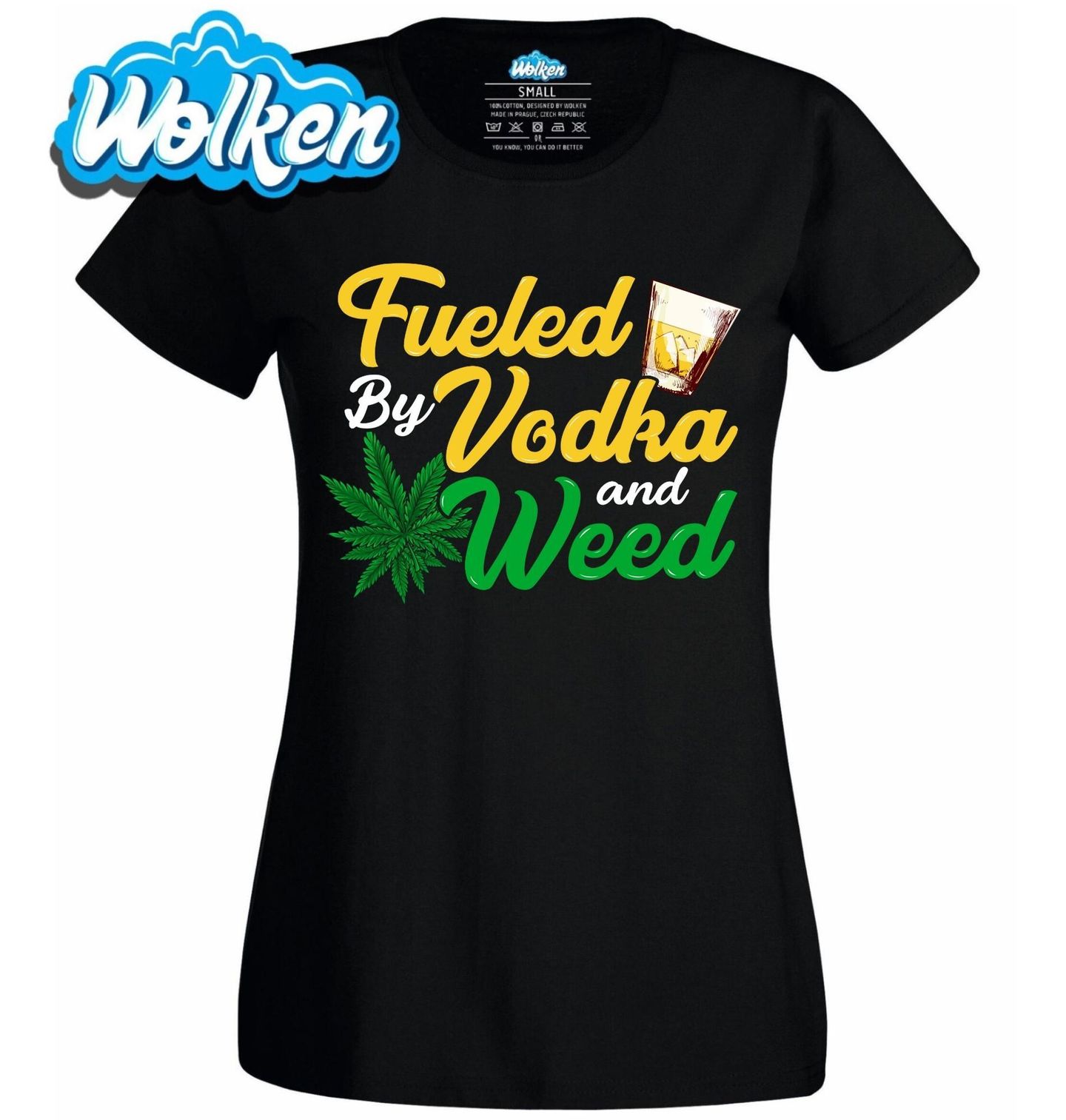 Dámské tričko Poháněno Vodkou a Trávou. Vodka, alkohol, marihuana a tráva – kombinace, která vystihuje volnomyšlenkáře s humorem. Motiv „Poháněno vodkou a trávou“ (Fueled by Vodka and Weed) skvěle padne na párty nebo pro každého, který má rád trochu alternativního stylu života.