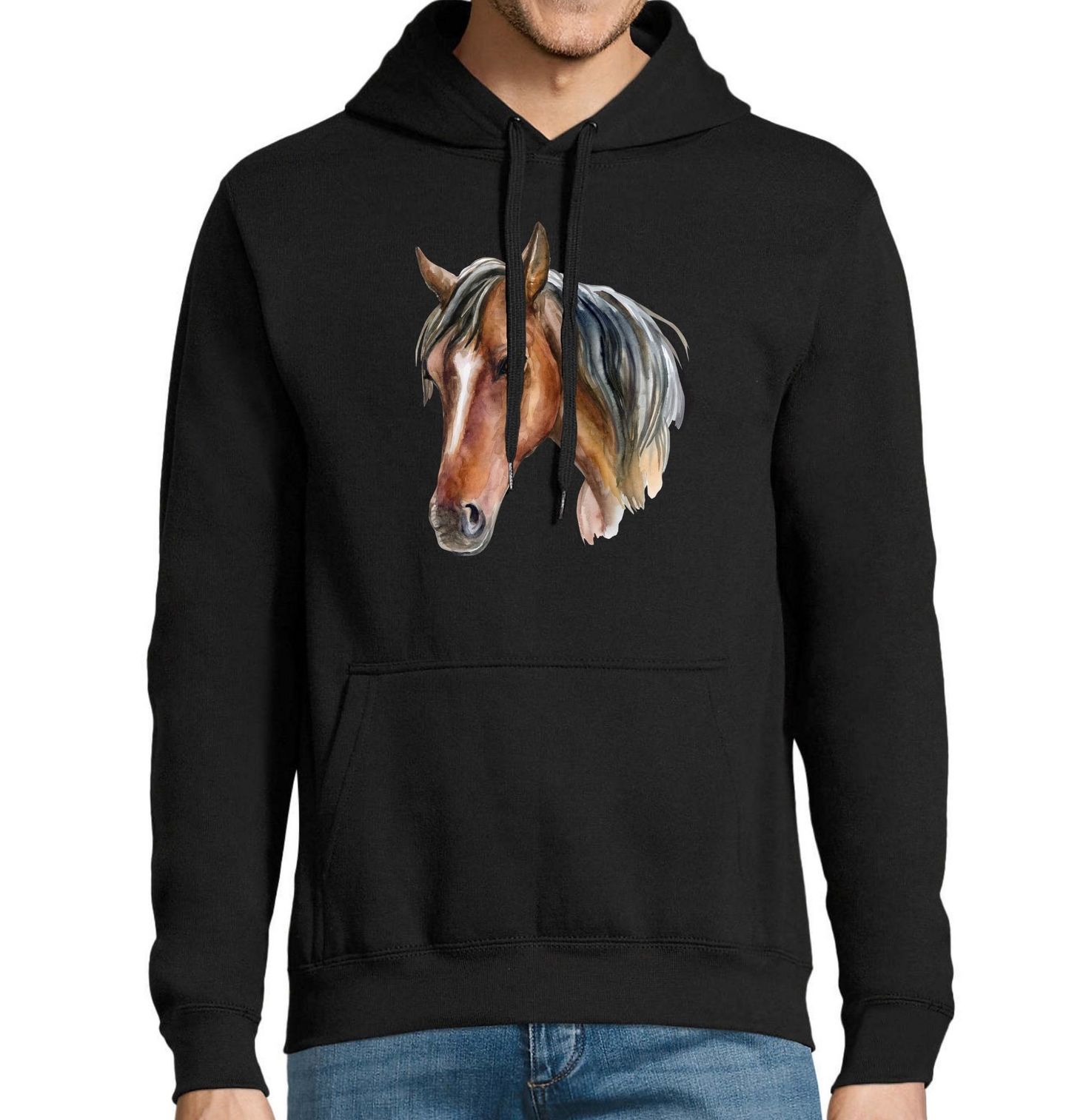 Pánská mikina Pohled Hnědého koně Brown Horse. Elegantní portrét hnědého koně, pravděpodobně hnědáka s krásnou kontrastní hřívou. Tento kůň v sobě nese sílu, odvahu a noblesu, což z něj dělá ideální motiv pro všechny milovníky koní. Akvarelový styl přidává jemnost a umělecký nádech, díky čemuž se hodí ke každodennímu nošení.
