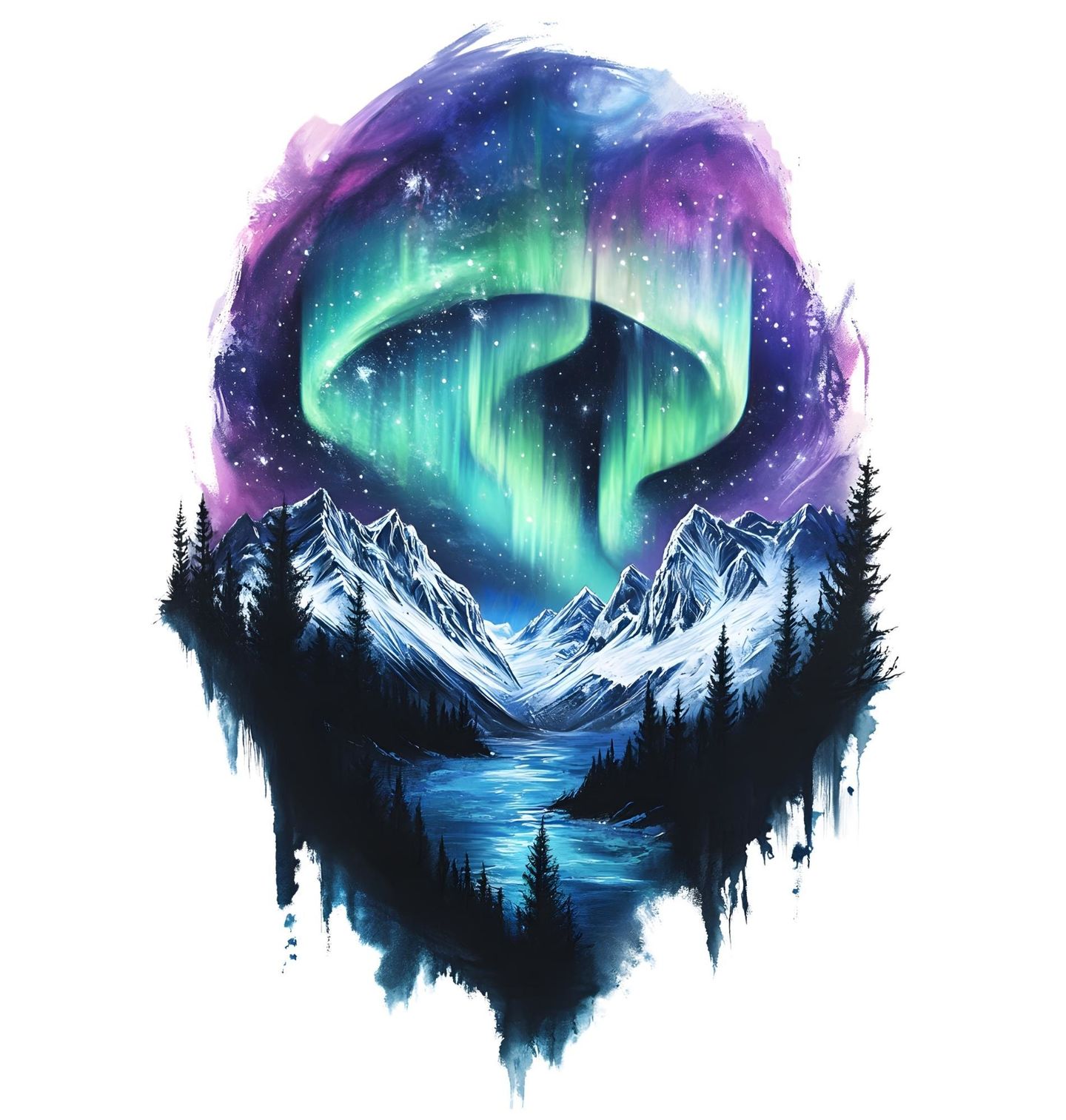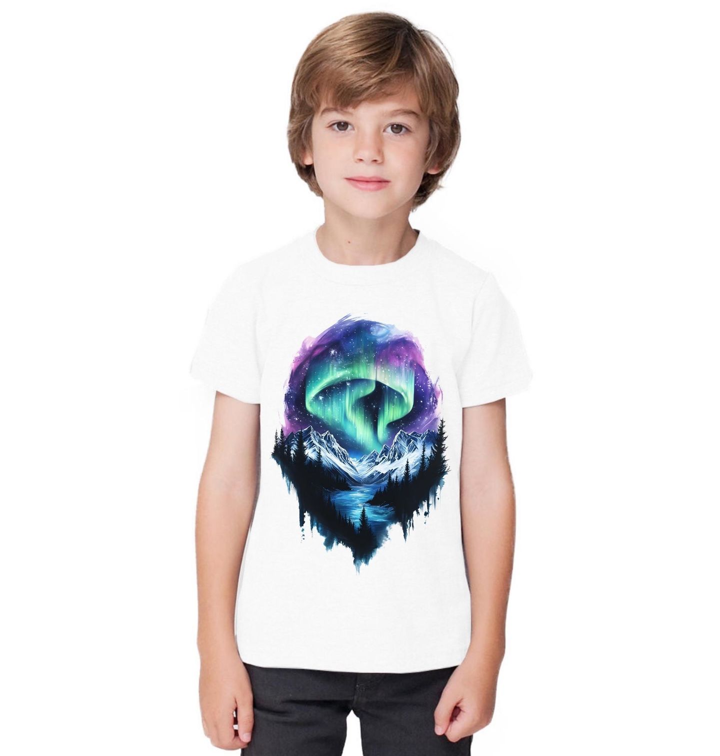 Dětské tričko Polární Záře nad Horami. Umělecký motiv zasněžených hor a klidné řeky pod noční oblohou, kterou osvětluje barevná polární záře v odstínech zelené, modré a fialové. Celá scéna působí mysticky a klidně. Pro všechny milovníky severských zemí.