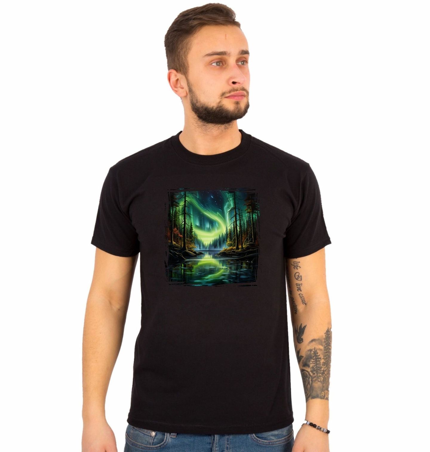 Pánské tričko Polární záře nad Lesním Jezerem. Nádherný fantasy motiv, který zachycuje tichý les obklopující klidné jezero, nad nímž se na noční obloze vlní zářivá polární záře. Stromy stojí jako strážci přírody a jejich siluety se dokonale odrážejí v hladině jezera, takže celý obraz působí magicky a snově.