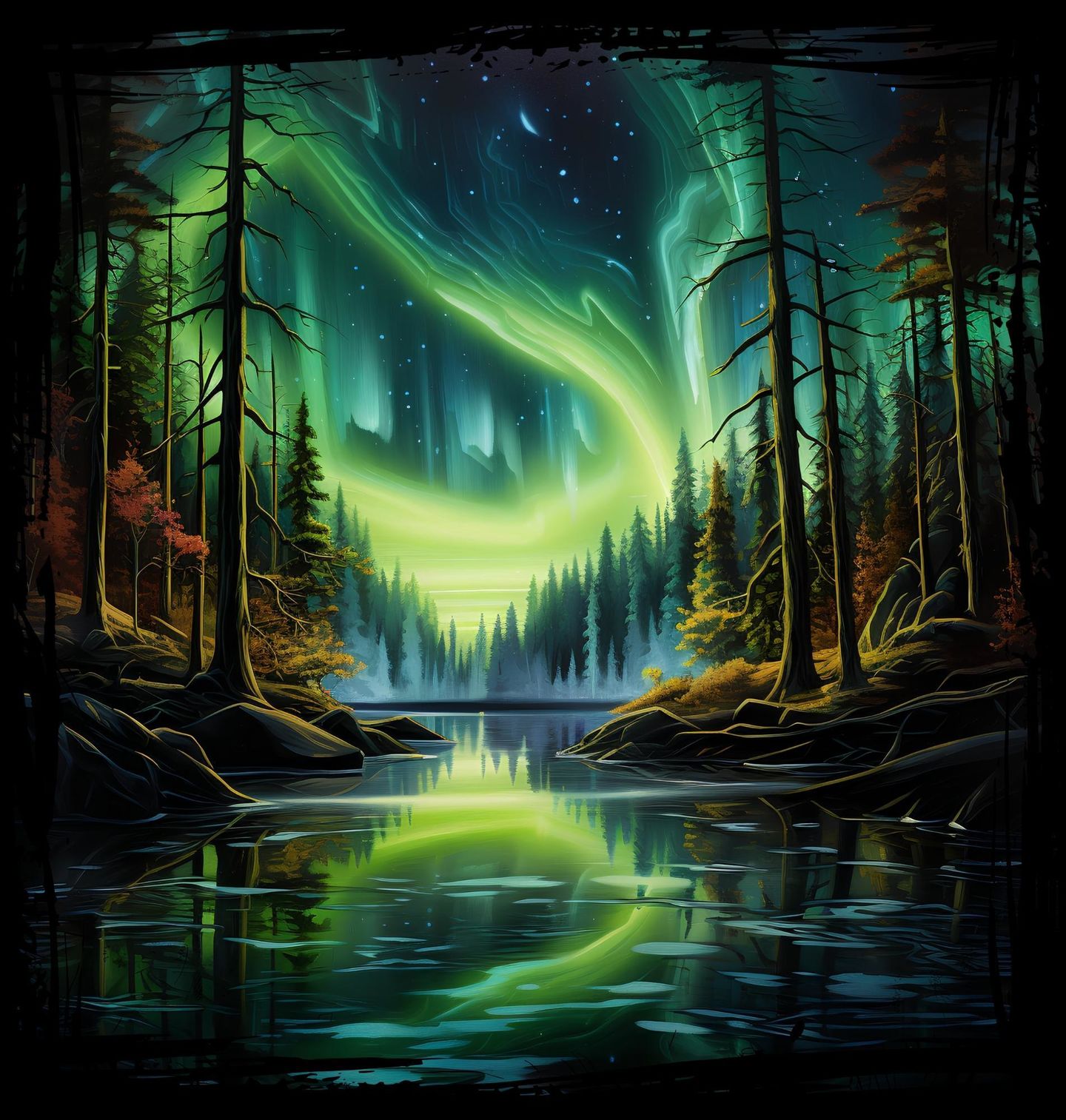 Pánská mikina Polární záře nad Lesním Jezerem. Nádherný fantasy motiv, který zachycuje tichý les obklopující klidné jezero, nad nímž se na noční obloze vlní zářivá polární záře. Stromy stojí jako strážci přírody a jejich siluety se dokonale odrážejí v hladině jezera, takže celý obraz působí magicky a snově.