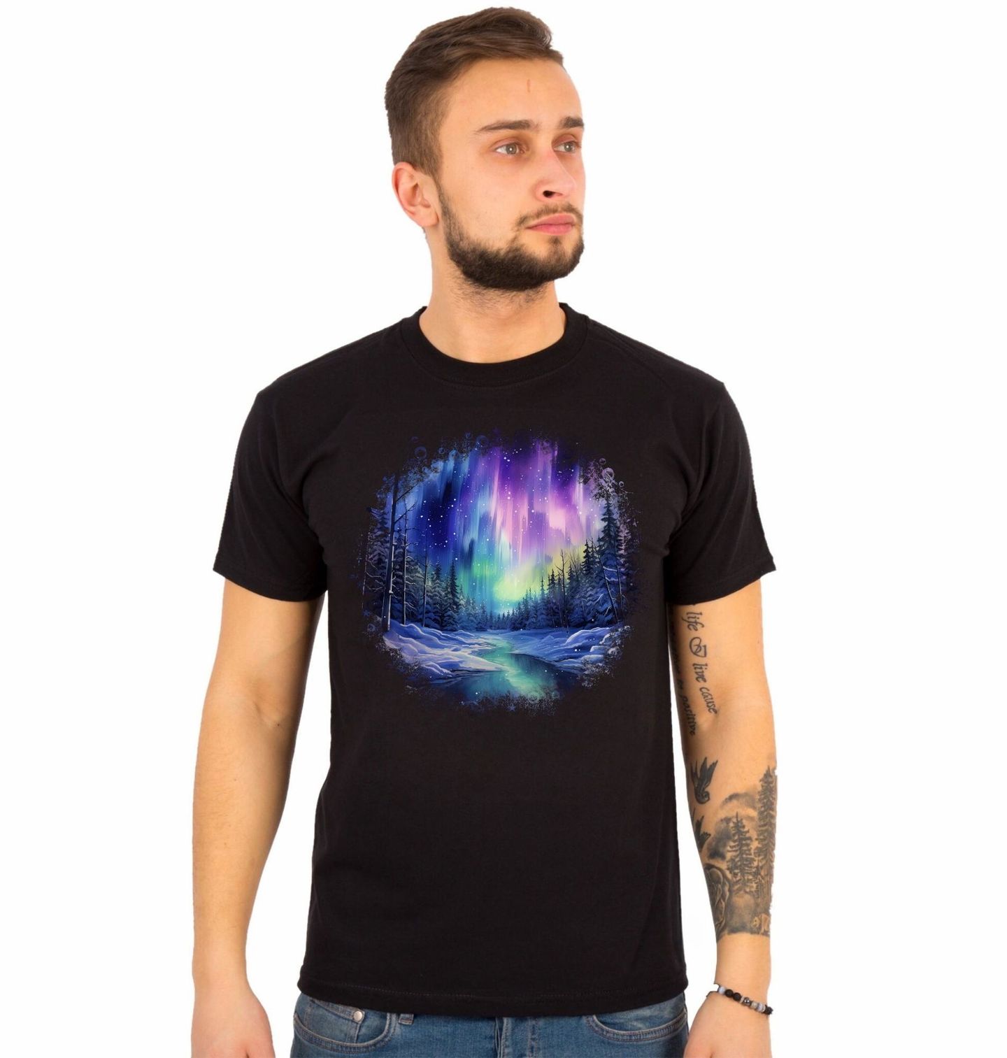 Pánské tričko Polární Záře nad Zasněženým Lesem. Tento kouzelný motiv zachycuje zimní krajinu, kde se zasněžené hory noří do ticha hlubokého lesa a nad nimi se v celé své kráse rozlévá polární záře. Barevné světlo noční oblohy kontrastuje s klidem, který přináší sníh, a vytváří atmosféru tajemného severu, kde příroda vládne tichem a harmonií.