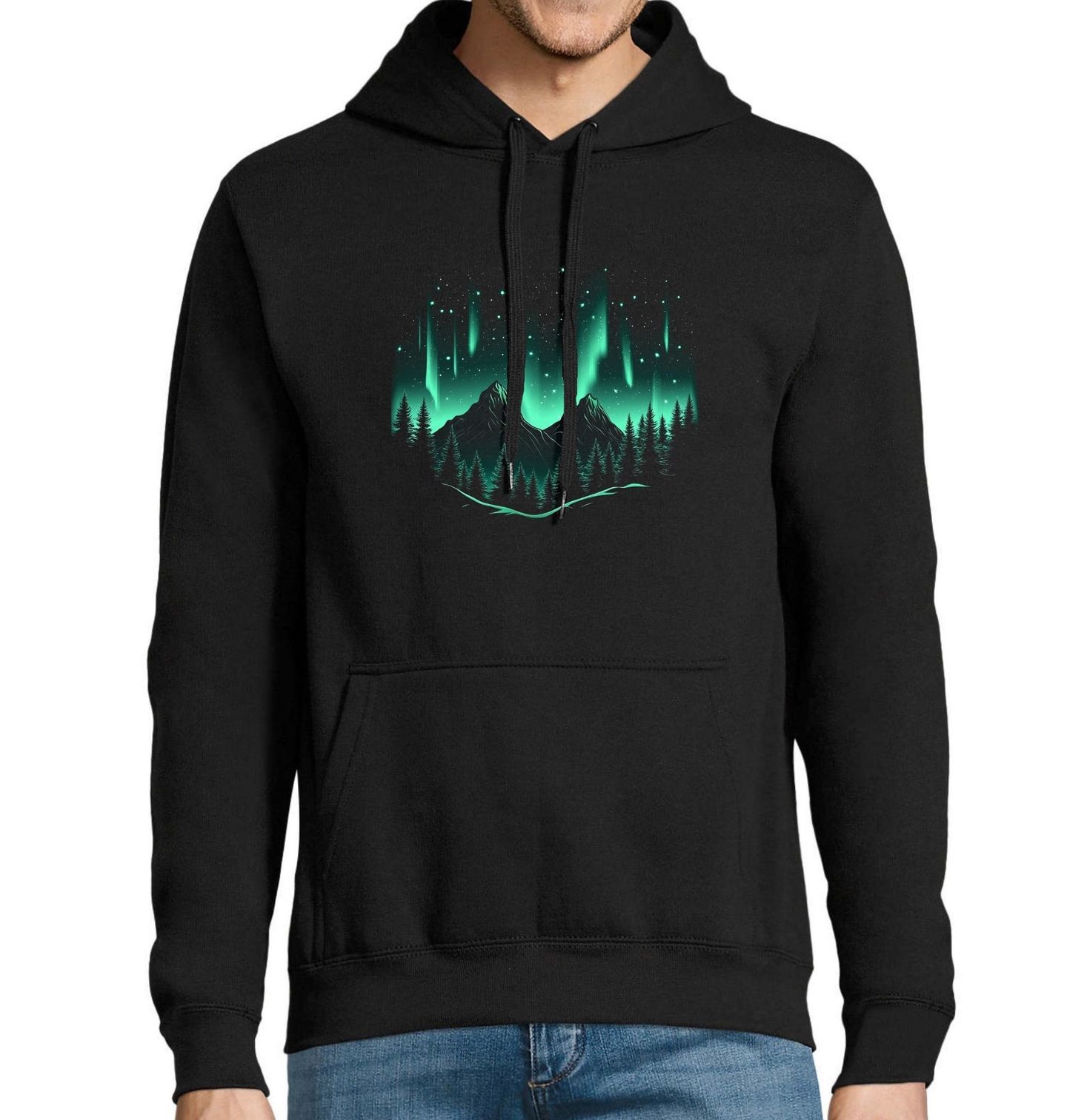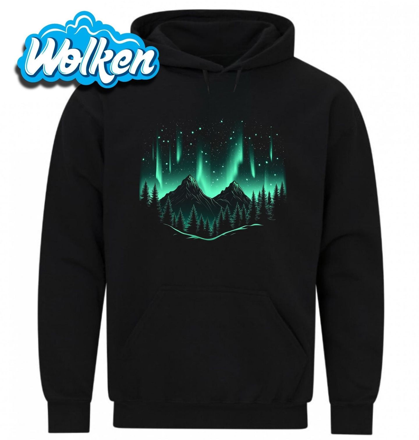 Pánská mikina Polární záře Northern Lights. Kouzelný motiv polární záře zachycený v celé své kráse – tiché hory, temný les a nad nimi tančící světelné opony. Tahle scéna ti připomene, jak ohromující umí být příroda, když se zhasnou města a rozsvítí nebe. Ideální pro všechny snílky, cestovatele a milovníky severské přírody.