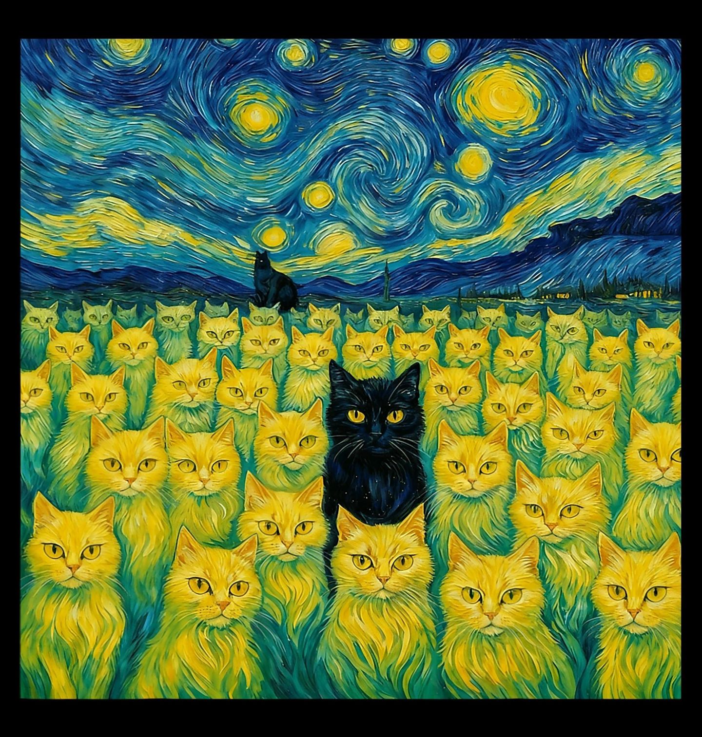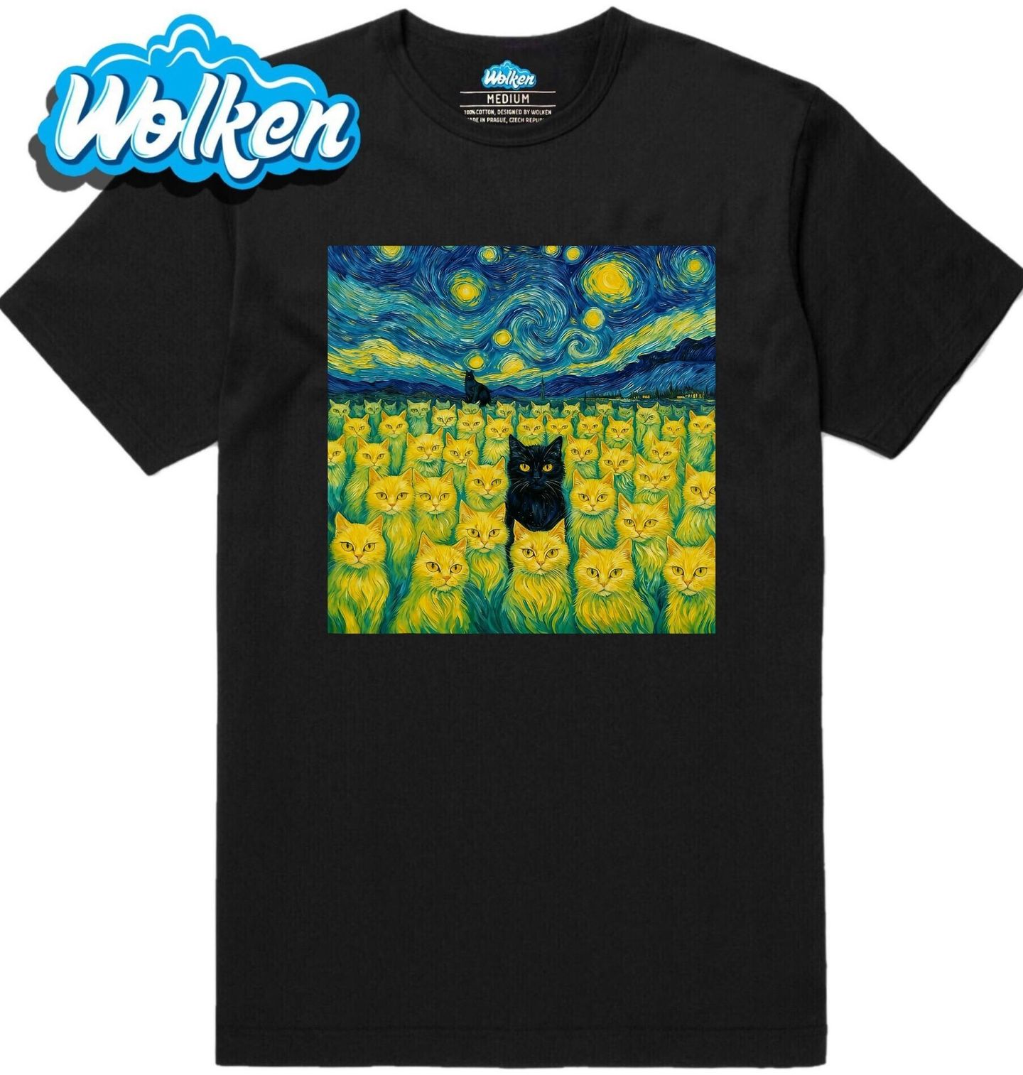 Pánské tričko Pole Koček ve Hvězdné Noci. Magická scéna inspirovaná slavným obrazem Hvězdná noc od Vincenta van Gogha, kde místo klasické krajiny dominují desítky zářivých žlutých koček. Uprostřed kompozice zaujme kontrastní černá kočka, která přitahuje pozornost a dotváří snovou, až surrealistickou atmosféru.