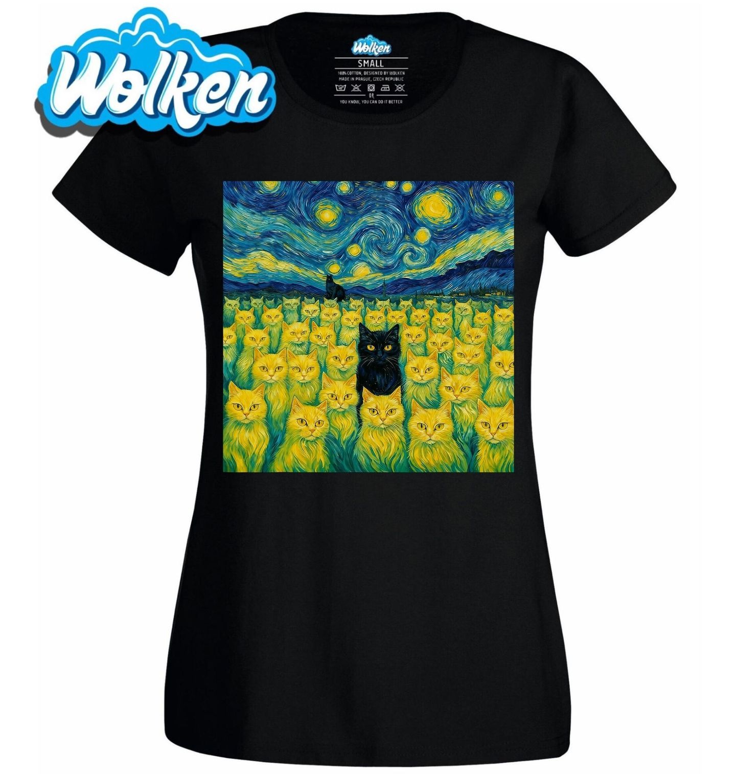 Dámské tričko Pole Koček ve Hvězdné Noci. Magická scéna inspirovaná slavným obrazem Hvězdná noc od Vincenta van Gogha, kde místo klasické krajiny dominují desítky zářivých žlutých koček. Uprostřed kompozice zaujme kontrastní černá kočka, která přitahuje pozornost a dotváří snovou, až surrealistickou atmosféru.