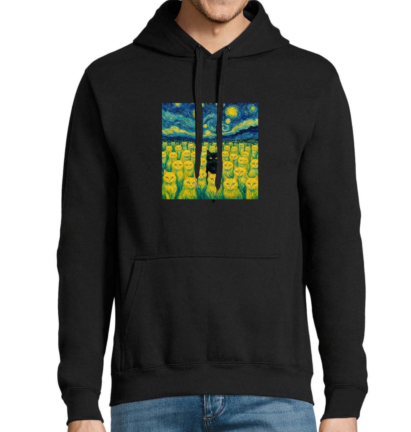 Pánská mikina Pole Koček ve Hvězdné Noci. Magická scéna inspirovaná slavným obrazem Hvězdná noc od Vincenta van Gogha, kde místo klasické krajiny dominují desítky zářivých žlutých koček. Uprostřed kompozice zaujme kontrastní černá kočka, která přitahuje pozornost a dotváří snovou, až surrealistickou atmosféru.