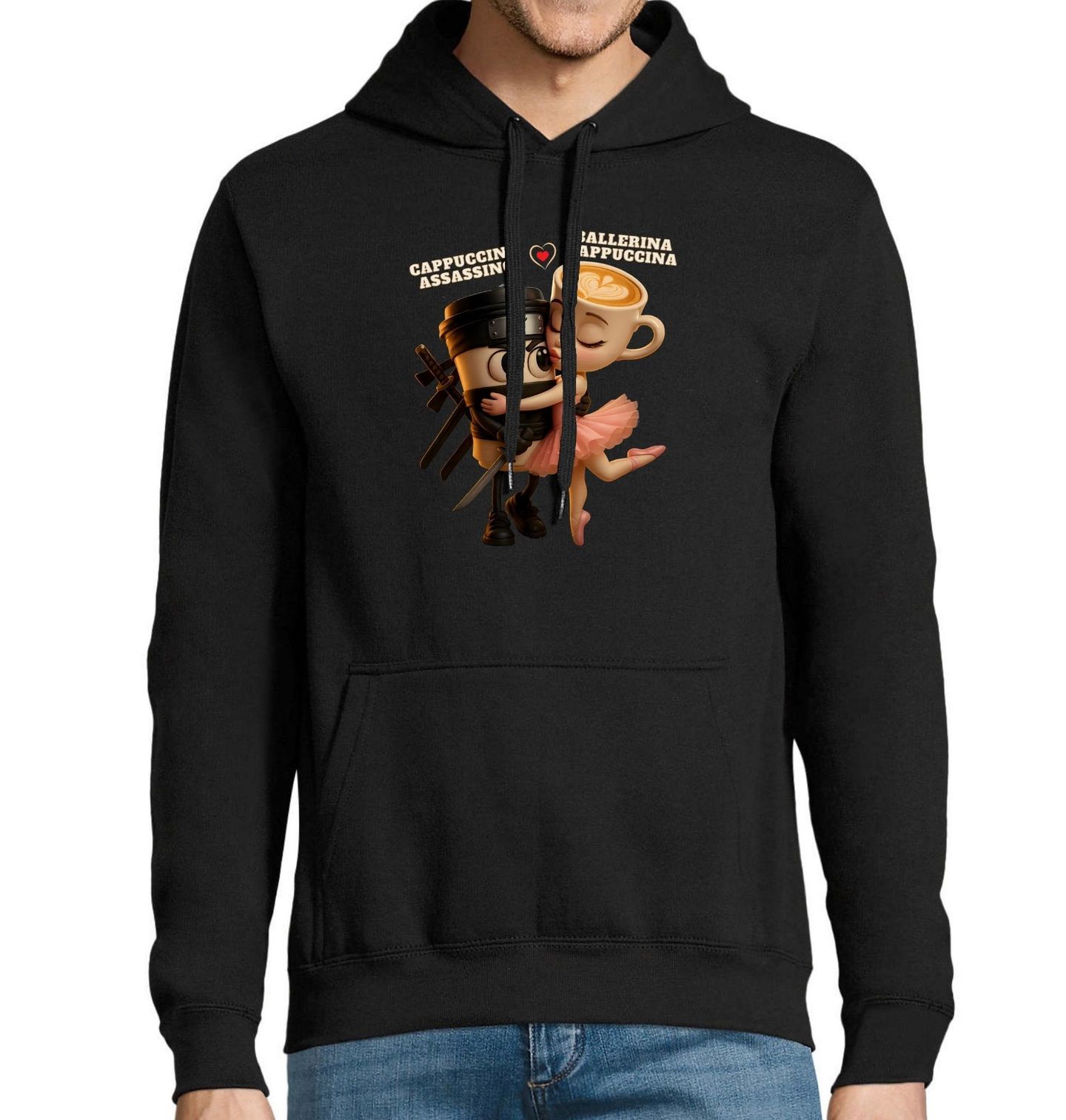 Pánská mikina Polibek Assassina a Balleriny. Láska na první doušek přináší dokonalou kombinaci romantiky a absurdního humoru, kterou ocení každý fanoušek internetových šíleností. V hlavních rolích se představuje neohrožený Cappuccino Assassino a něžná Ballerina Cappuccina – dvojice, která propojuje svět lásky a světa meme a brainrot postaviček.