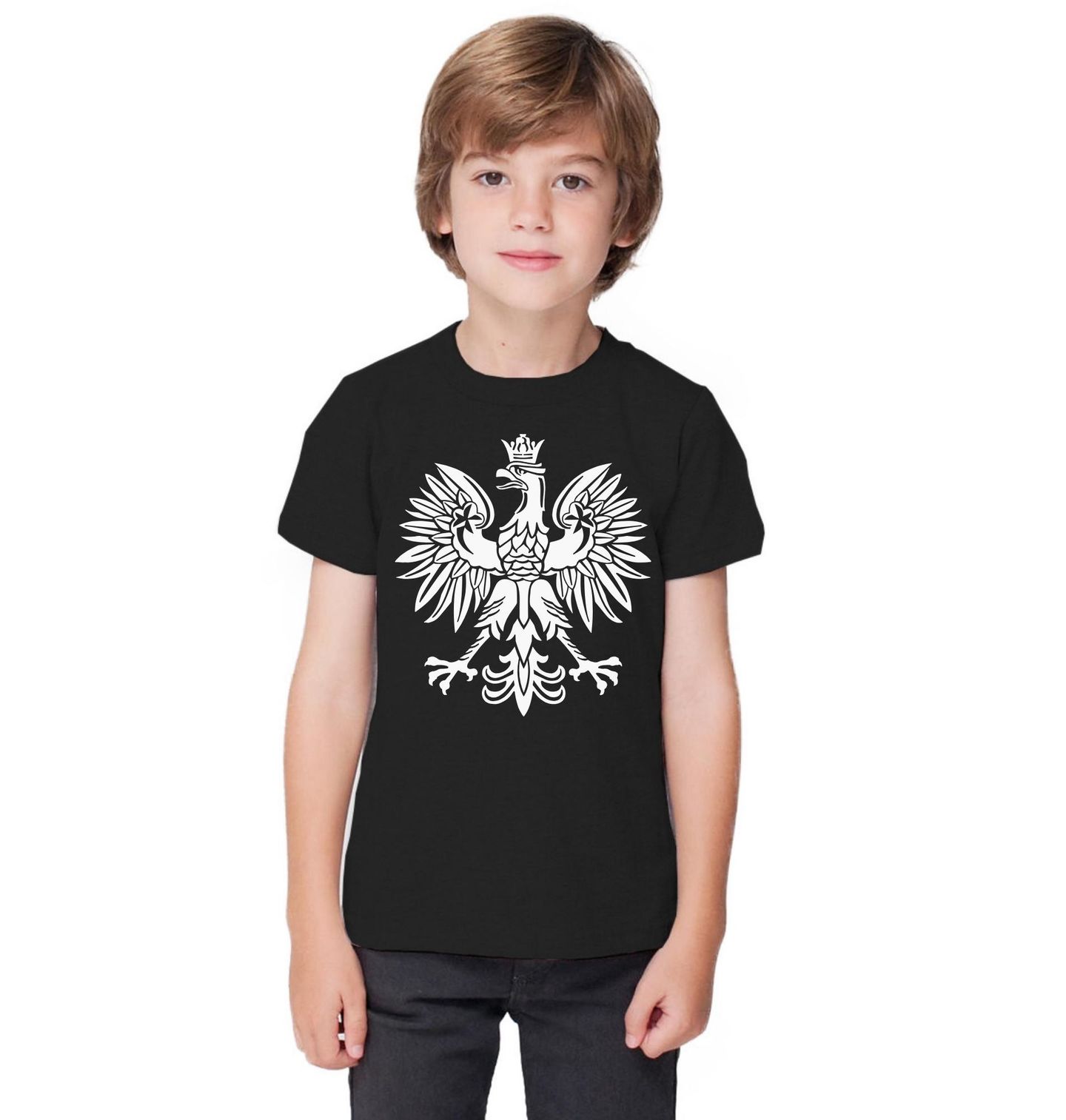 Dětské tričko Polská Orlice. Detailní ilustrace orla s korunou symbolizuje sílu a tradici Polska. Symetrie a ostré linie dodávají designu autoritu. Design orel je perfektní pro milovníky heraldiky a symboliky.
