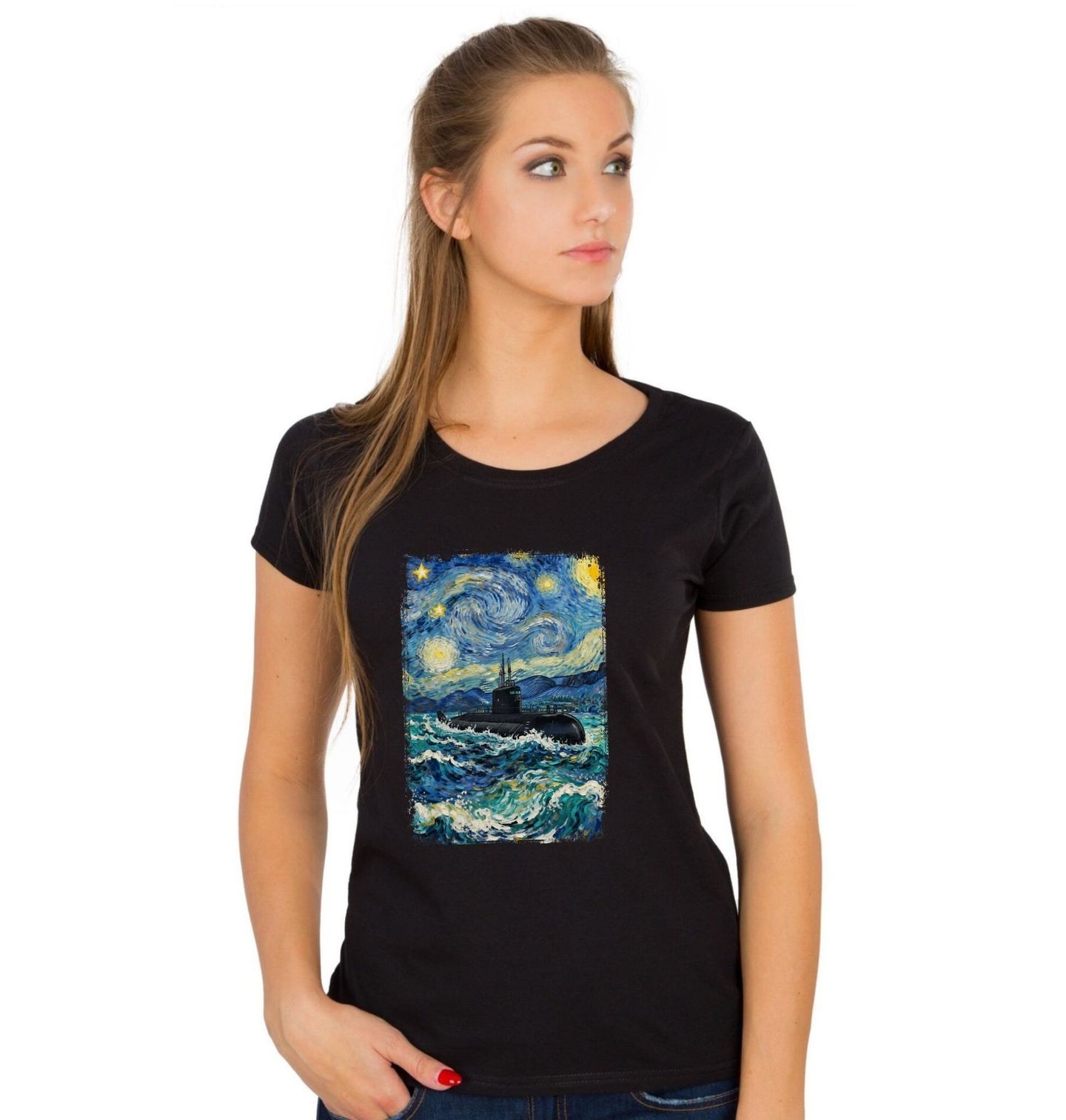 Dámské tričko Ponorka ve Hvězdné noci. Originální motiv, který propojuje slavný obraz Hvězdná noc a malířský styl Vincenta van Gogha s tematikou moře a techniky. Uprostřed rozbouřených vln se nese tmavá ponorka, která působí, jako by patřila do světa, kde se setkává umění a armáda.